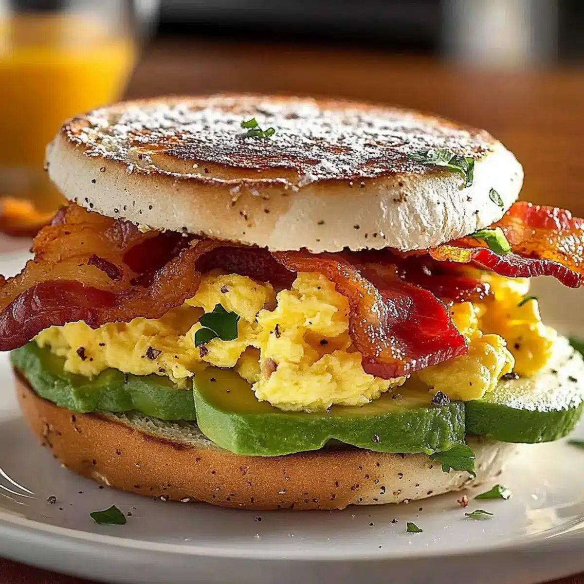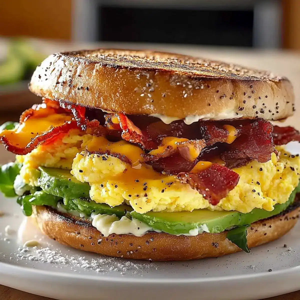 - Assemble Sandwich: Layer scrambled eggs, cheddar cheese, crispy bacon, and lemony avocado on one half of the toasted muffin, adding optional tomato slices and spinach before topping with the other muffin half.