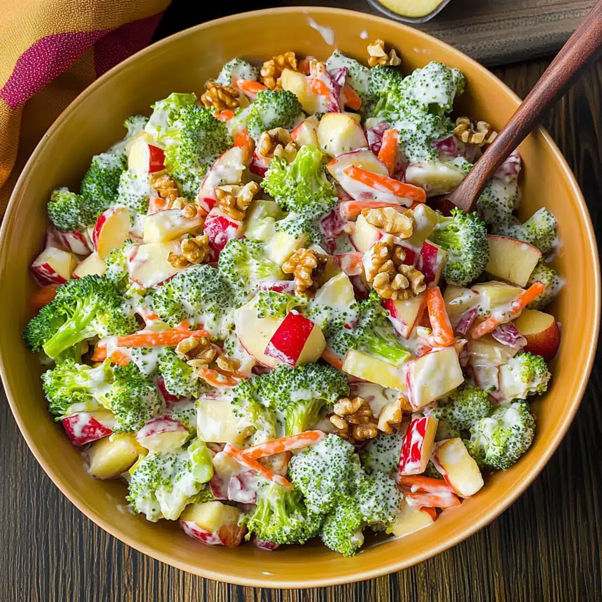 - In a large mixing bowl, combine the broccoli, apples, walnuts, carrots, golden raisins, and red onion. Toss gently until evenly distributed.