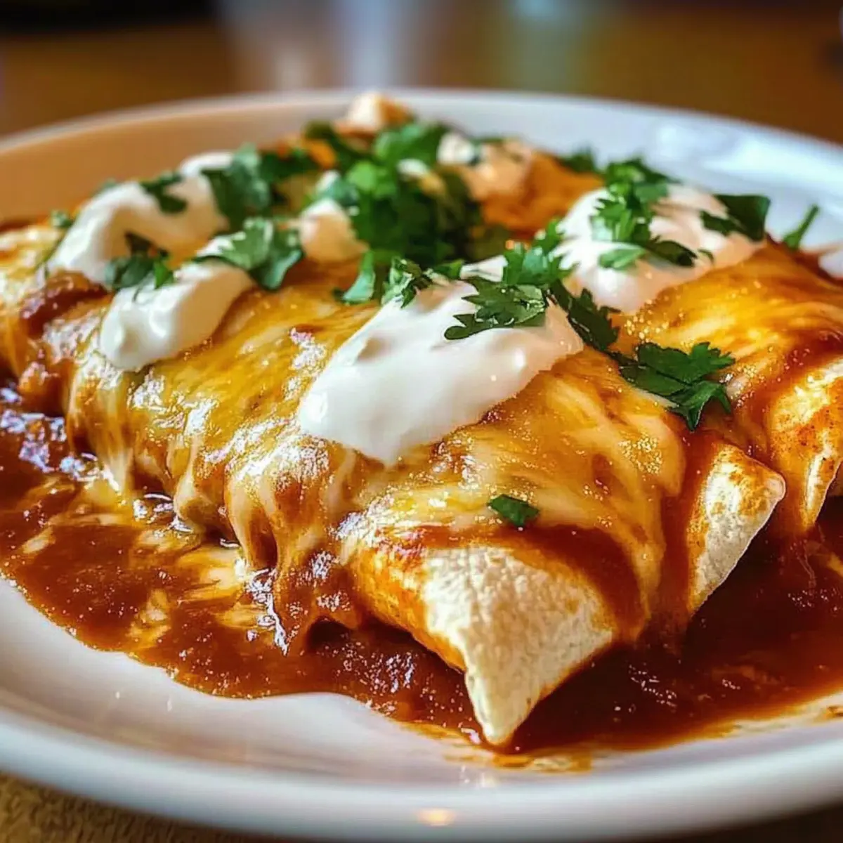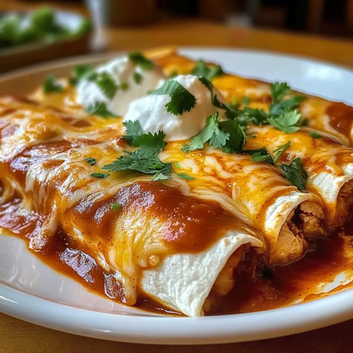 Once baked, remove the foil and bake for an additional 5-10 minutes until the cheese is bubbly and golden brown. Let the Chicken Enchiladas rest for a few minutes before garnishing with chopped cilantro and serving with a dollop of sour cream. This resting time strengthens the flavors and makes serving them easier.