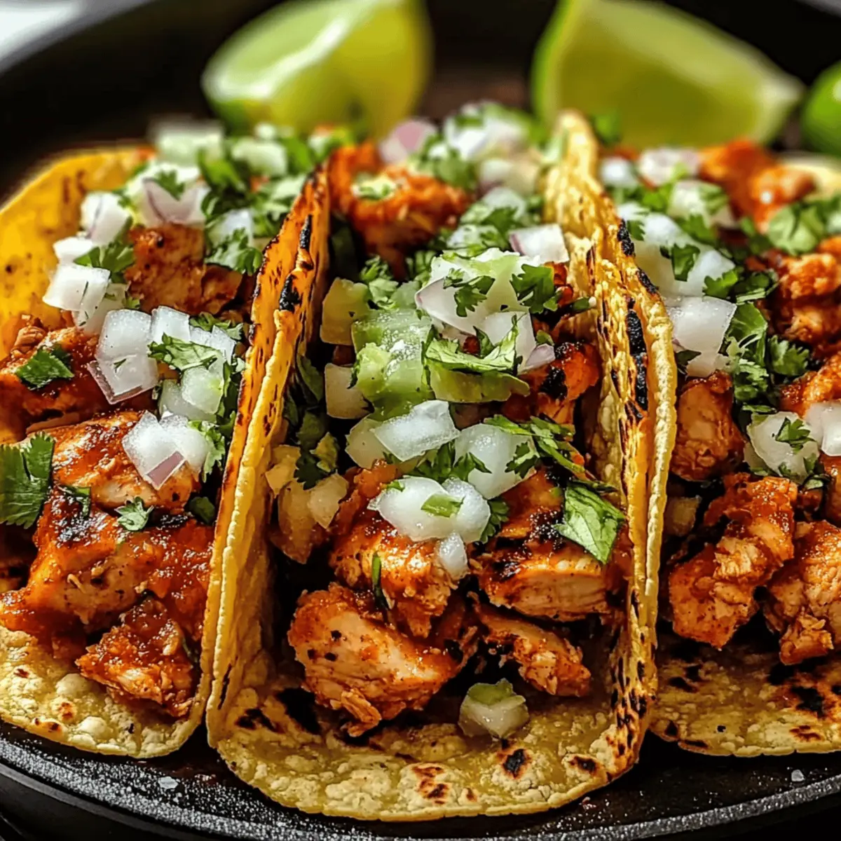 Now it’s time to assemble your Chicken Street Tacos! Place a generous portion of the sliced chicken inside each warm tortilla. Top with chopped white onions, fresh cilantro, and a squeeze of lime juice. Feel free to add any optional toppings you love—sliced avocado, crumbled cotija cheese, pickled red onions, or salsa verde make delightful additions to your taco.