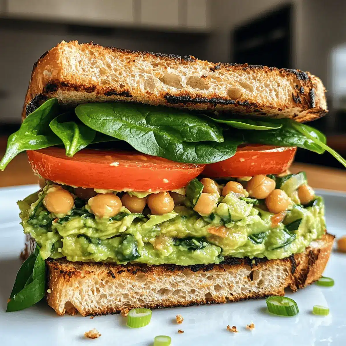 Spread a generous portion of the chickpea-avocado mixture onto one slice of toasted bread. Layer on your chosen toppings, such as fresh spinach, tomato slices, and onion. Press down gently with another slice of bread to hold everything together firmly, allowing the flavors to combine beautifully.