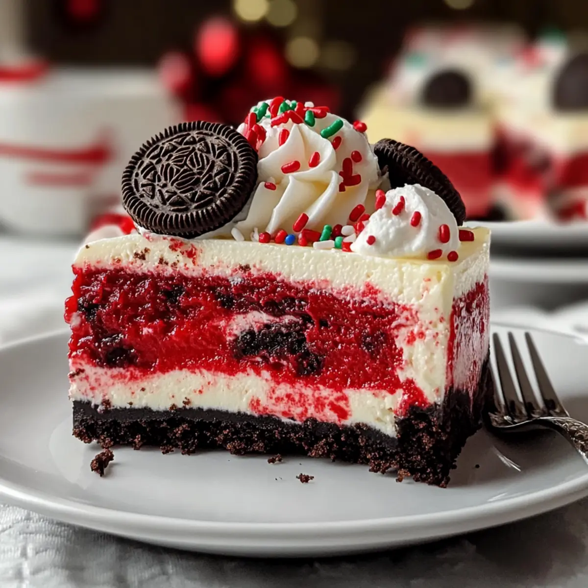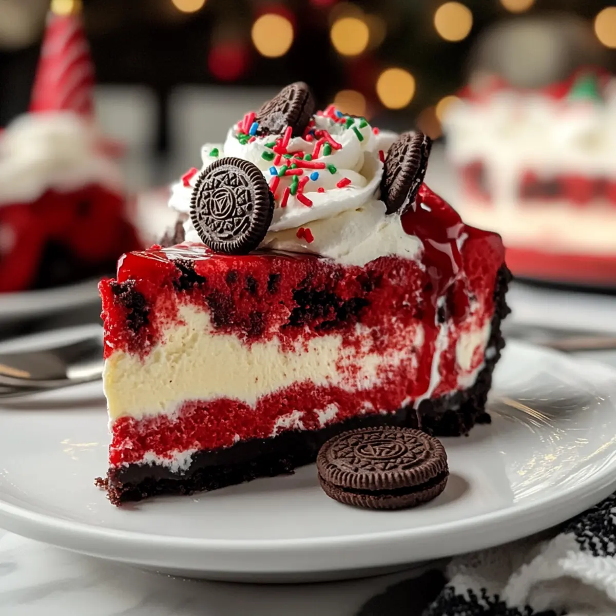 When ready to serve, carefully release the cheesecake from the springform pan, ensuring a clean edge. Top your creation with a generous layer of whipped cream, followed by mini Oreos and extra Christmas sprinkles for that festive touch. Use a hot, clean knife to slice through the layers for perfectly neat pieces of your delicious cheesecake.