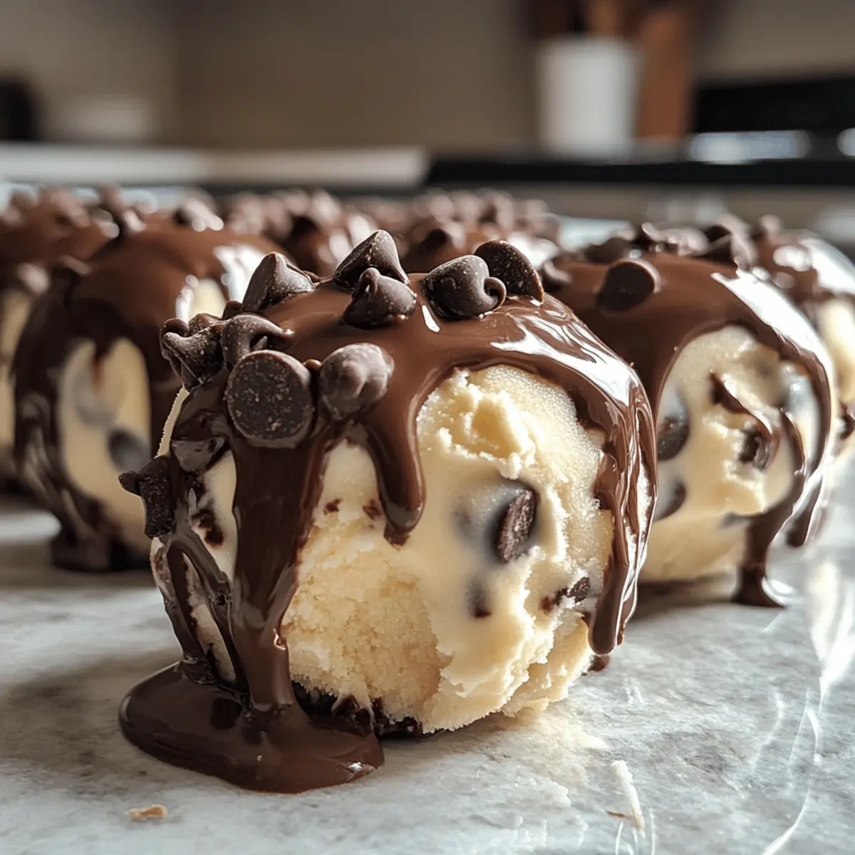 - Dip each frozen bite into the melted chocolate, allowing excess to drip off. Return to the baking sheet.