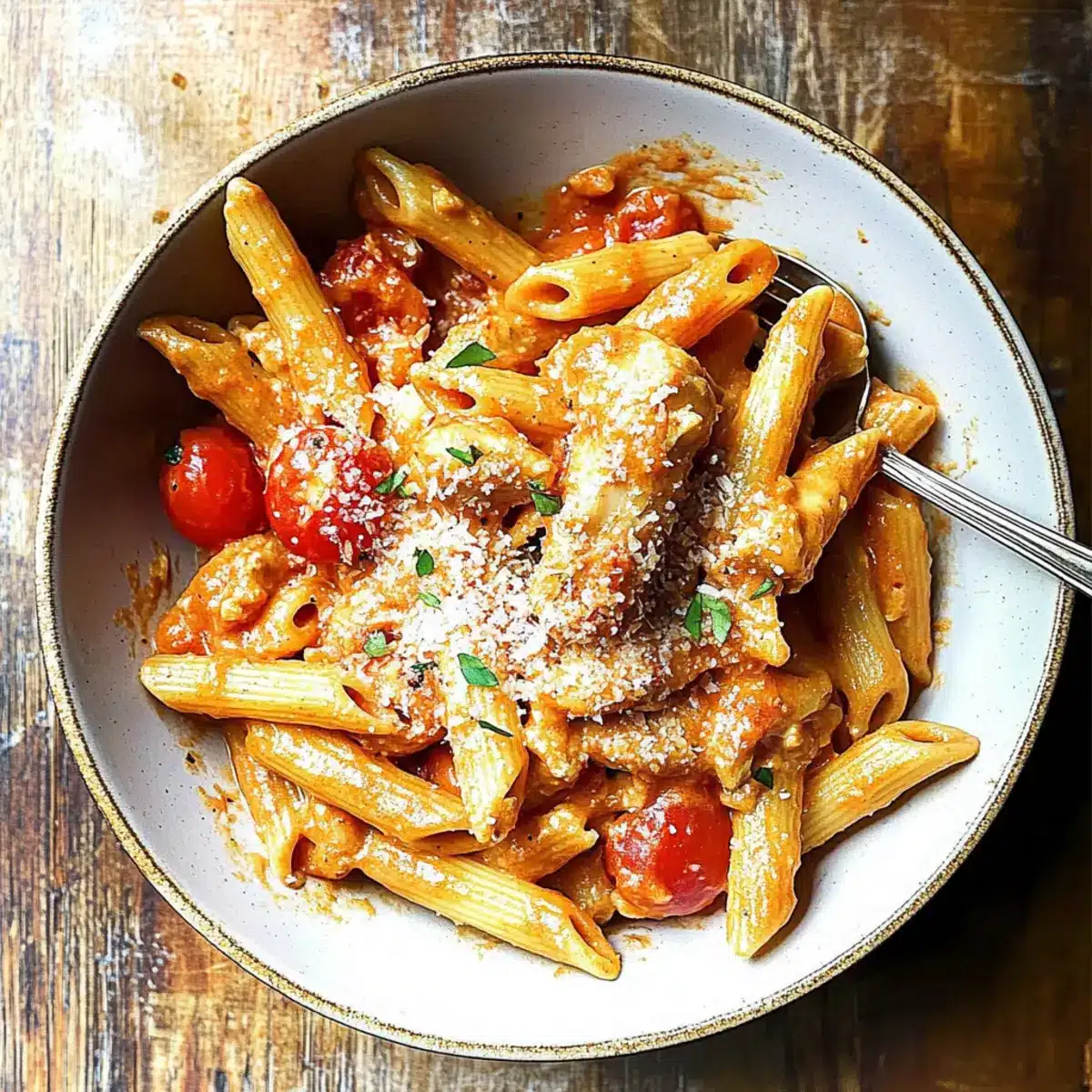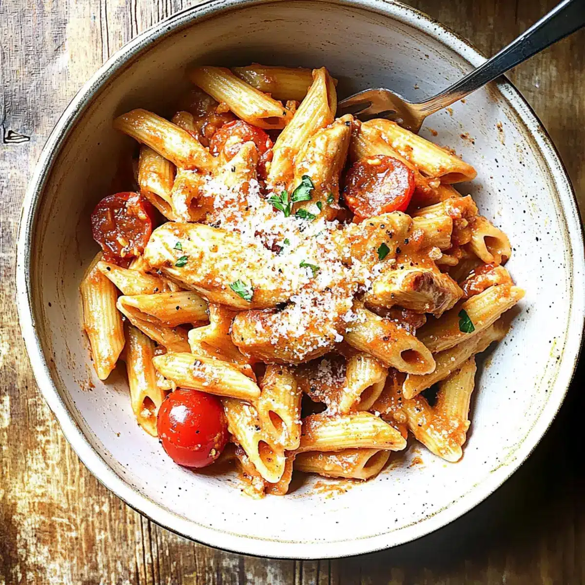 Plate the Creamy Chicken all’Arrabbiata, garnishing with extra grated Parmesan cheese, additional red pepper flakes, and a sprinkle of black pepper. Serve immediately while hot, and enjoy this comforting pasta dish with family or friends!