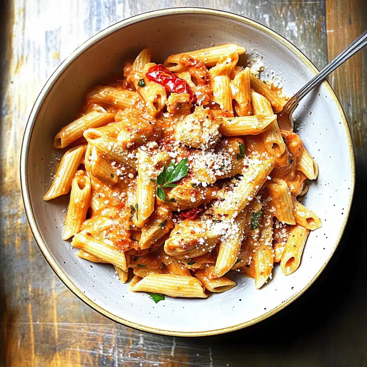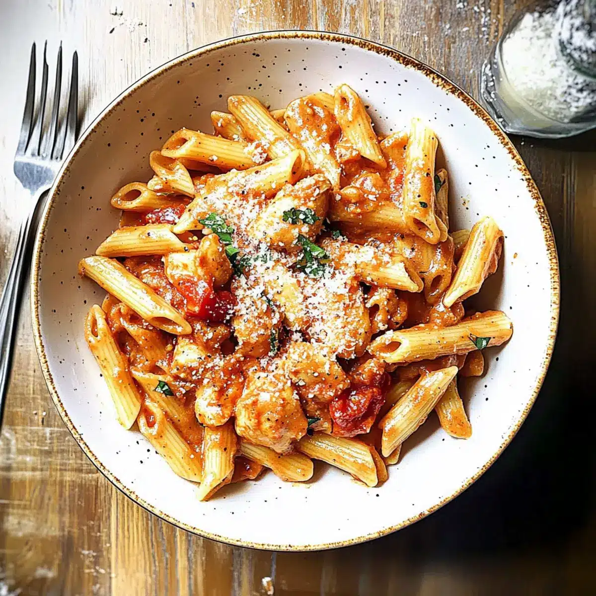 Plate the creamy chicken all’Arrabbiata, and sprinkle with additional grated Parmesan and a dash of freshly cracked black pepper. Enjoy this spicy, comforting pasta dish warm, garnished with chopped parsley for a fresh touch. Your meal is now ready to be savored!