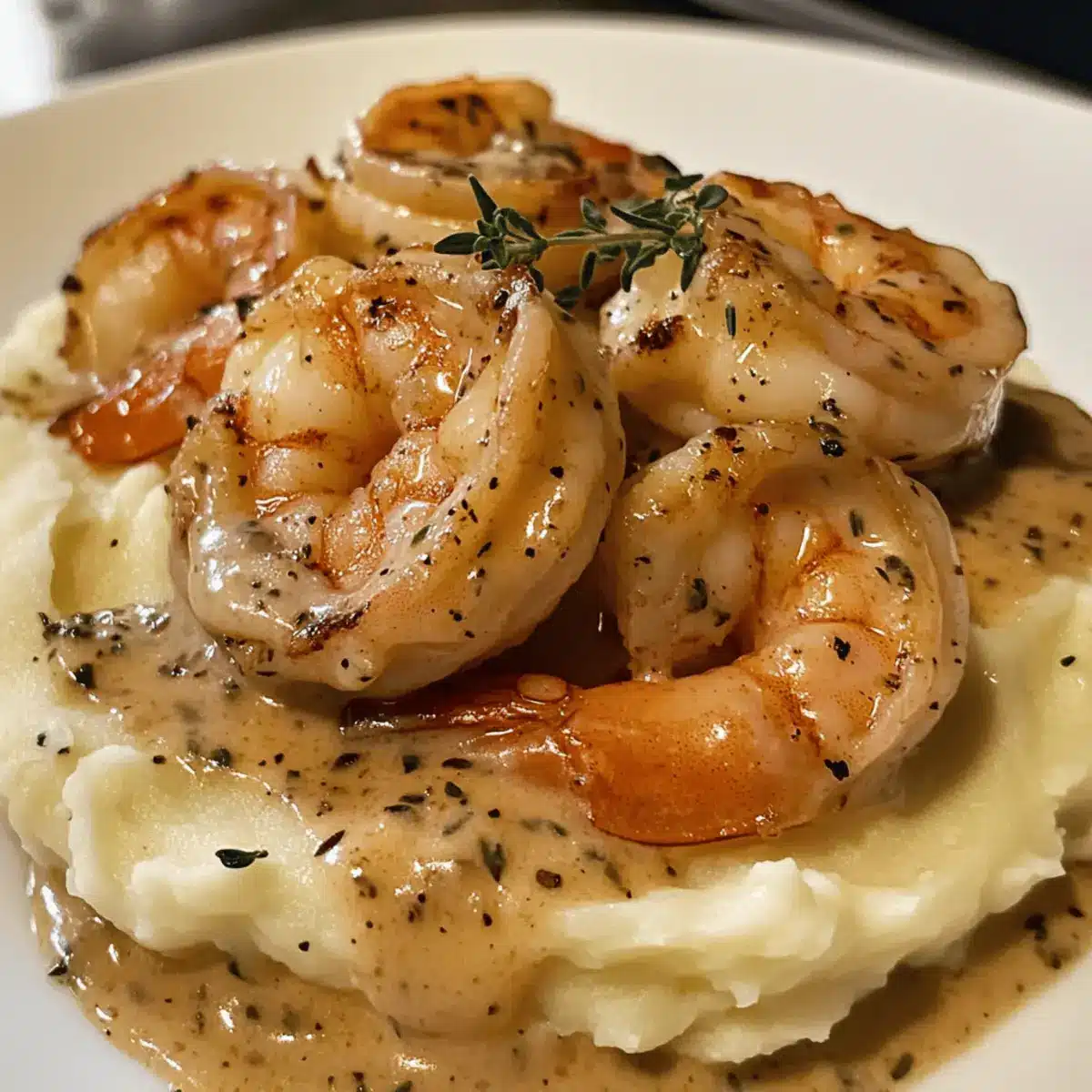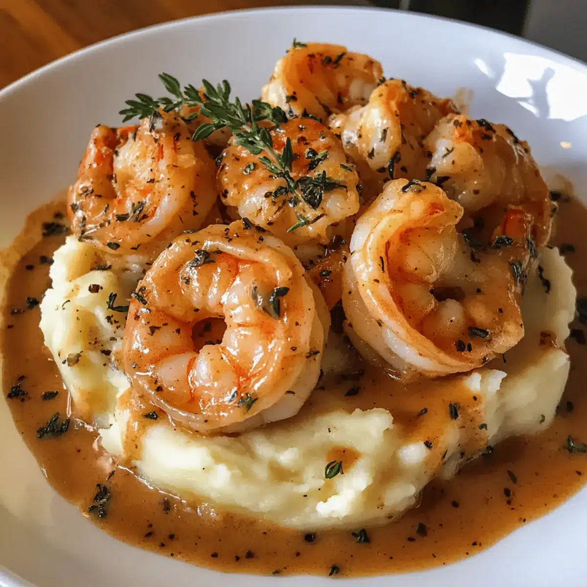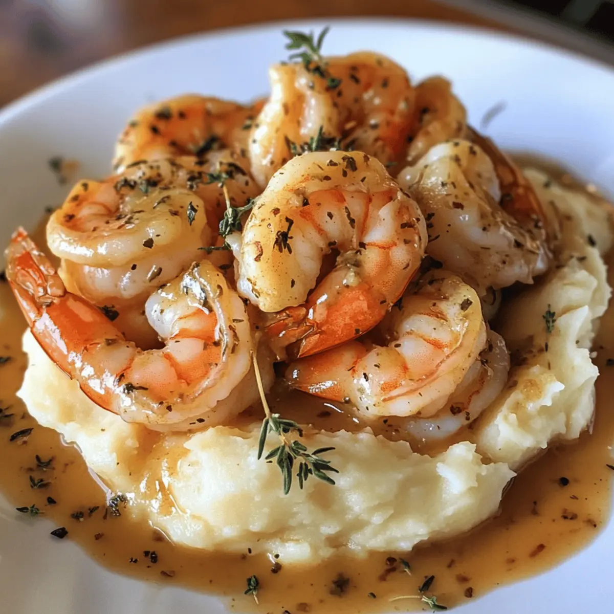 - Allow the sauce to simmer for 3-5 minutes until slightly thickened. Return shrimp to the skillet to coat in sauce. Serve the mashed potatoes topped with shrimp and sauce, garnished with fresh thyme.