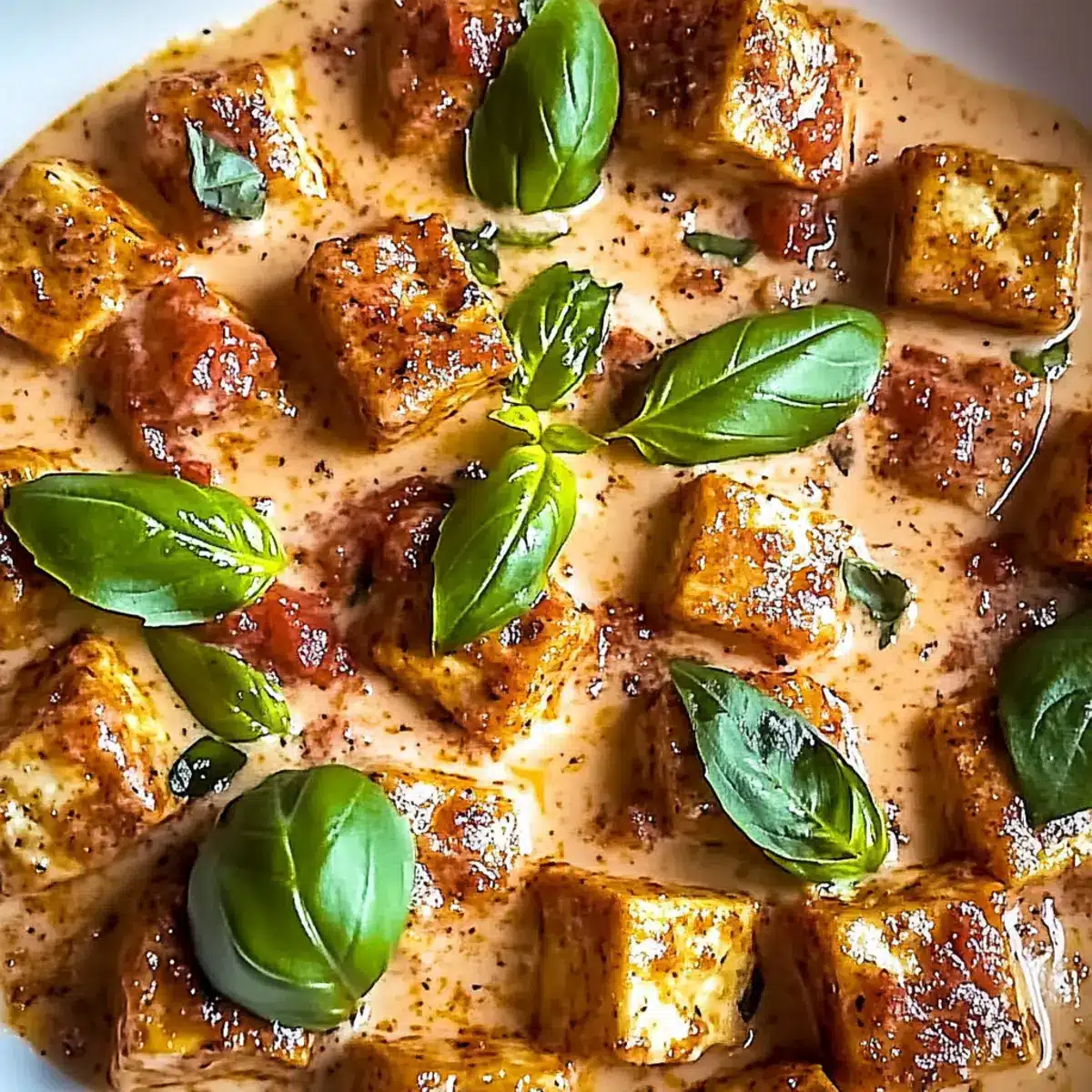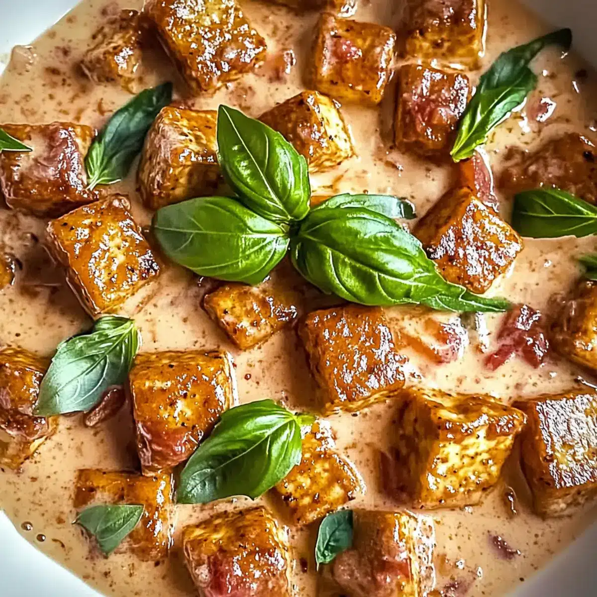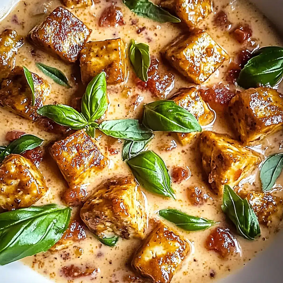 - Fold the fried tofu into the creamy garlic tomato sauce, along with the oil-packed sun-dried tomatoes. Stir gently and allow to heat through for an additional 2-3 minutes.
