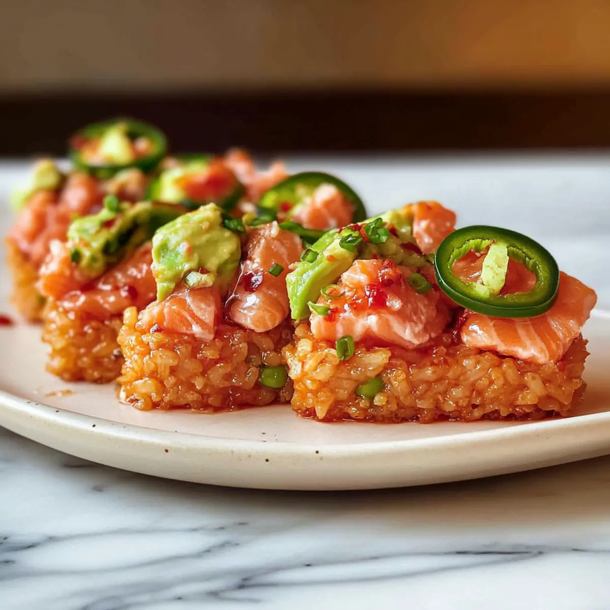 Once the crispy rice blocks have cooled slightly, it’s time to assemble your dish! Top each piece with slices of creamy avocado and a generous spoonful of the spicy salmon mixture. Garnish with thin slices of jalapeño, drizzle with more toasted sesame oil, and finish with toasted white sesame seeds and a swirl of sweet chili sauce. Serve immediately for a delightful crispy rice with spicy salmon experience.