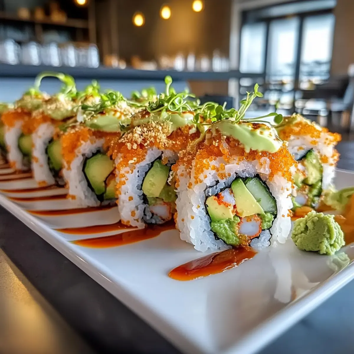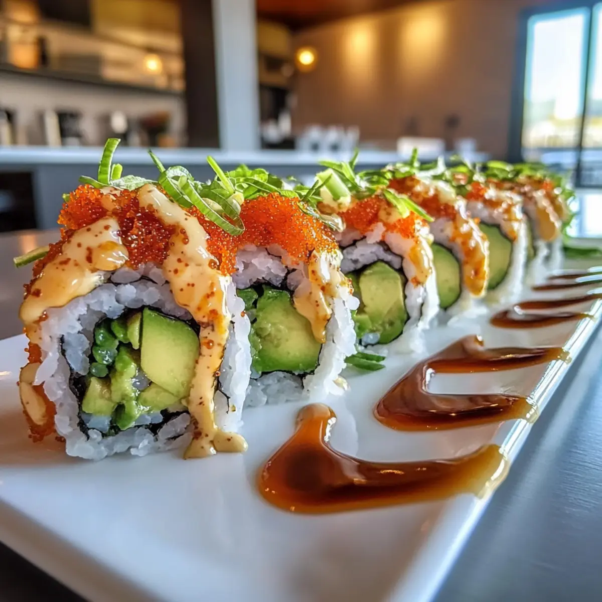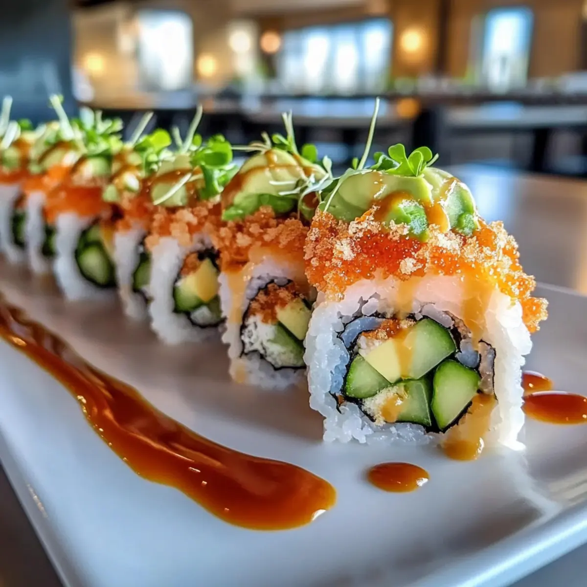 Arrange your sliced Dragon Rolls on a platter, and consider garnishing with tempura flakes or sesame seeds for added flair. Serve them with small bowls of soy sauce for dipping, along with optional wasabi and pickled ginger on the side. Your homemade sushi is ready to impress your family and friends with its beautiful presentation!