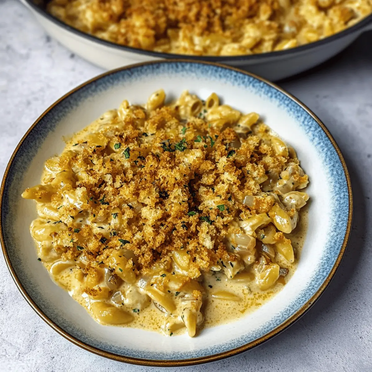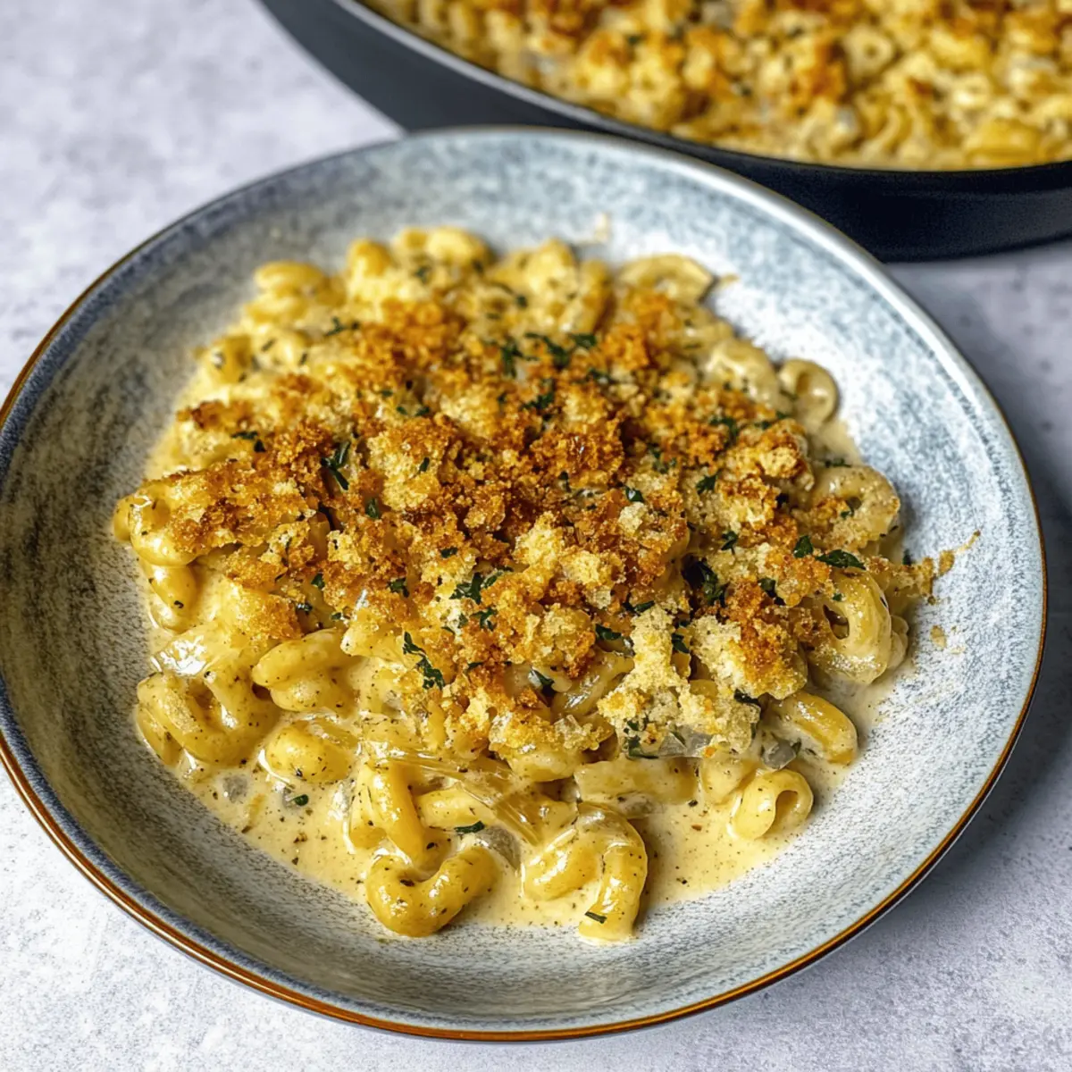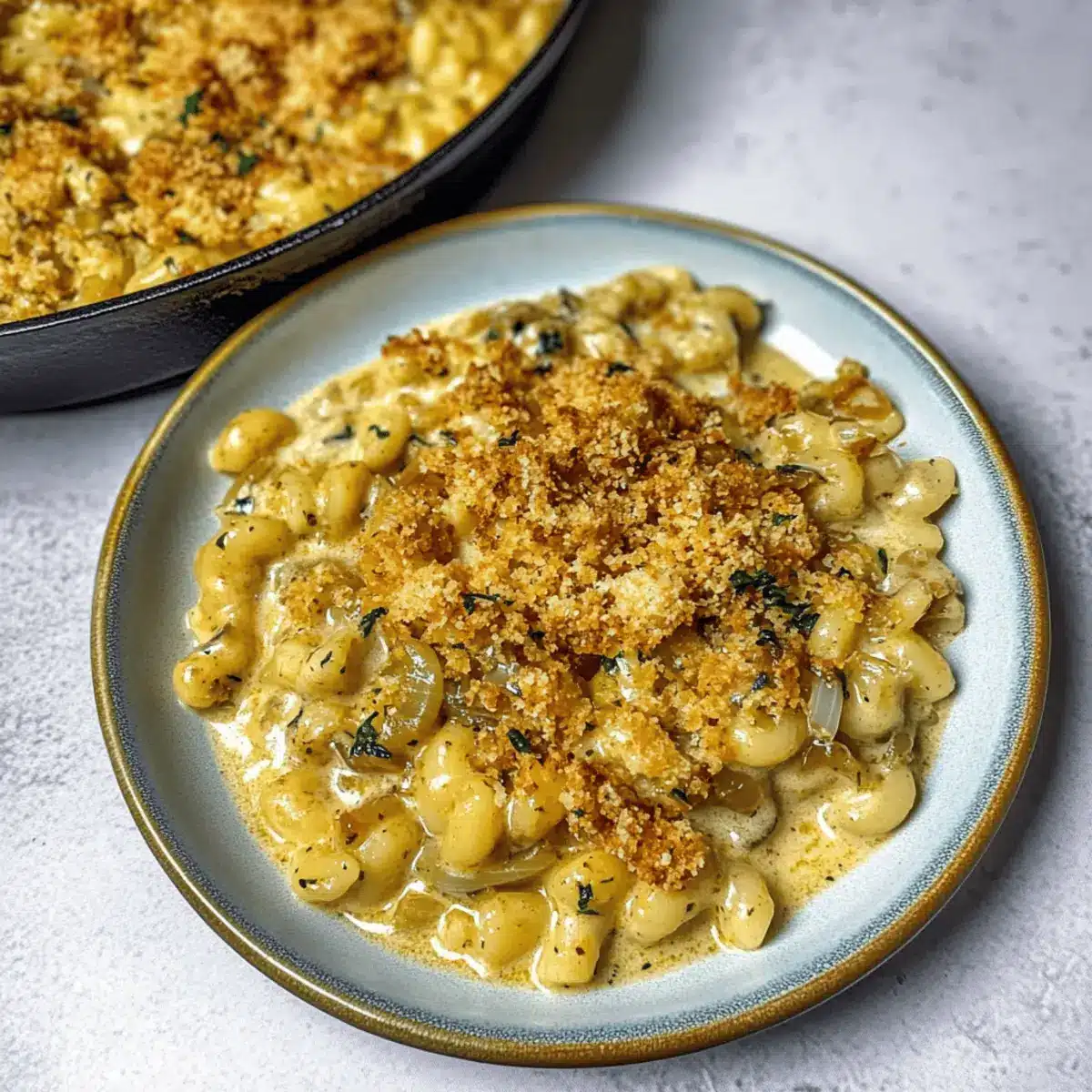 Preheat your oven to 350°F (175°C). Transfer the creamy French onion soup pasta mixture into a greased baking dish. Top with the remaining caramelized onions, spreading them evenly. For the breadcrumb topping, prepare by toasting pieces of stale baguette in olive oil, then sprinkle them over the pasta. Bake the dish uncovered for 10-15 minutes until the breadcrumbs are golden and crispy, creating a delicious layer on top.