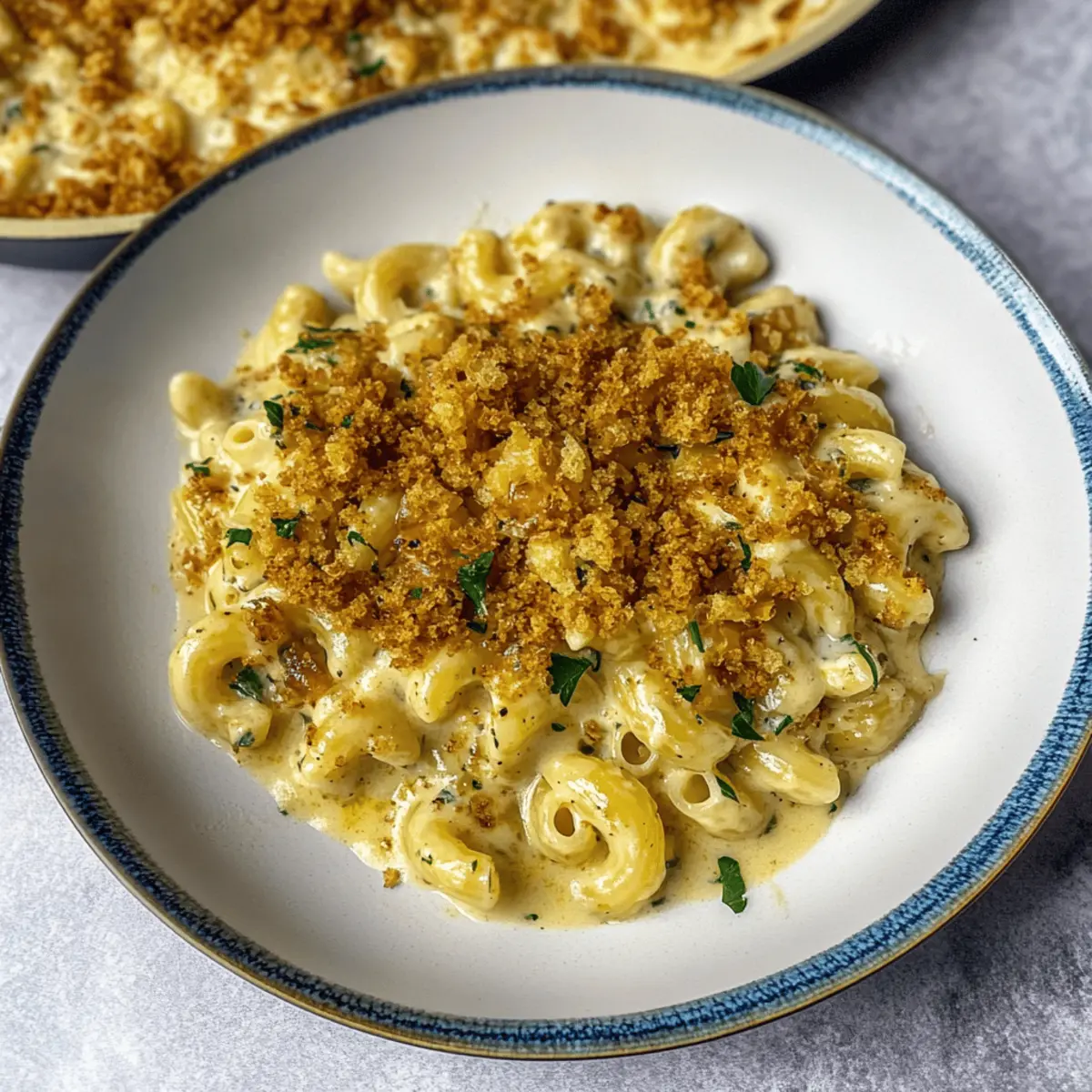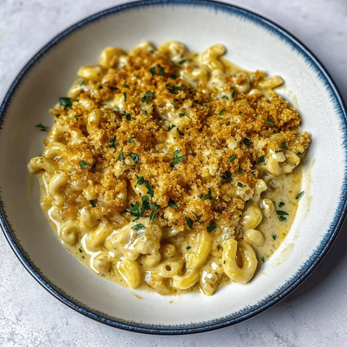 Sprinkle the remaining caramelized onions evenly over the pasta mixture. In a small bowl, mix breadcrumbs with a drizzle of olive oil and a pinch of salt, then sprinkle them generously on top of the pasta. Bake in a preheated oven at 350°F (175°C) for 10-15 minutes, or until the breadcrumbs are golden and crispy.