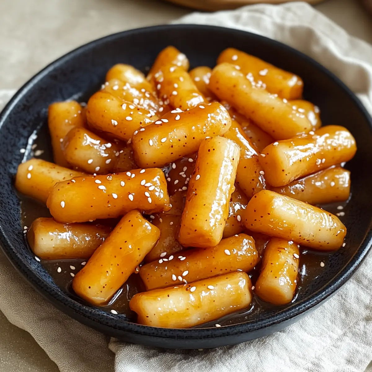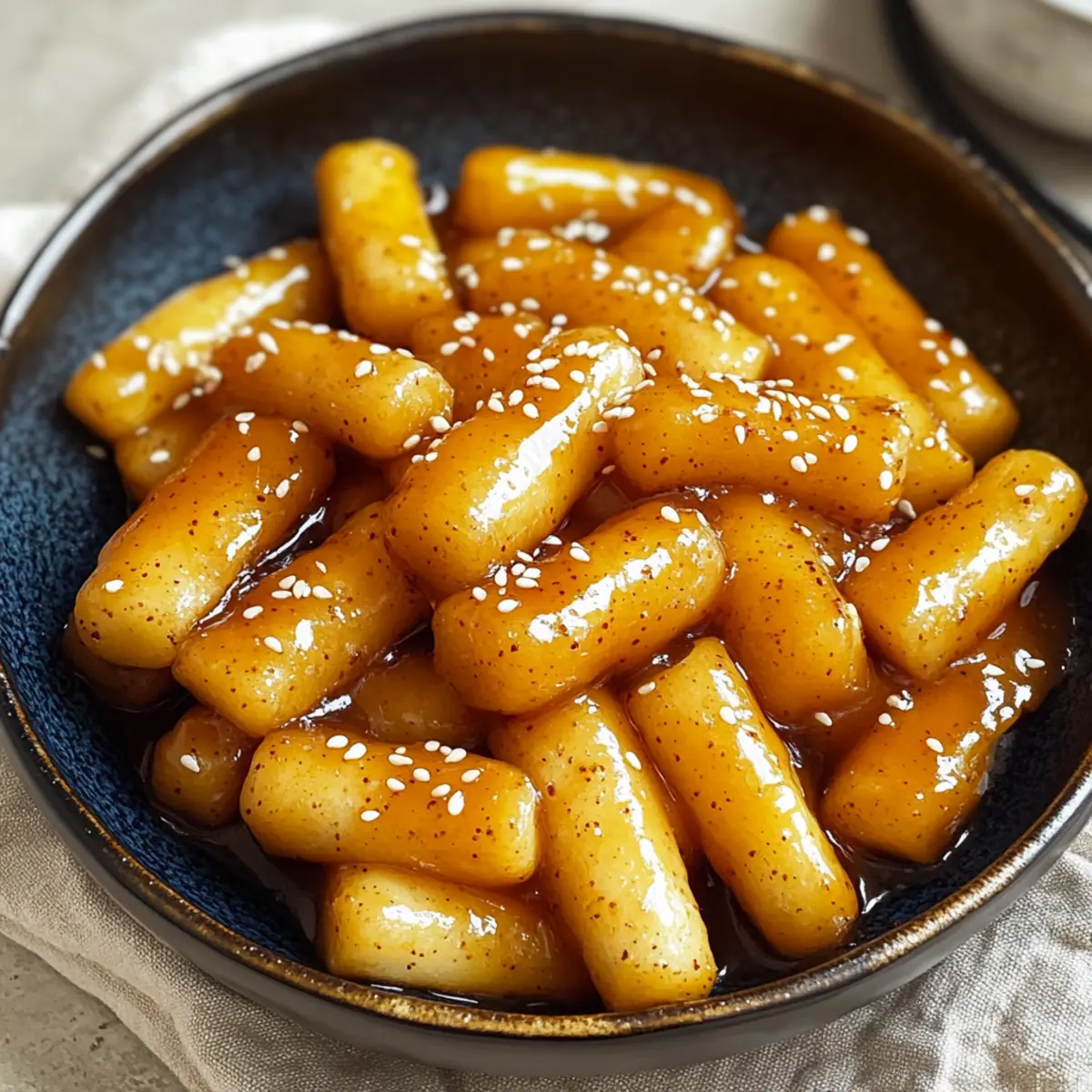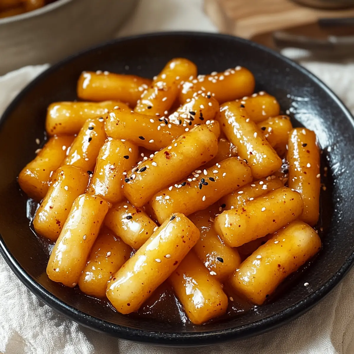 - Transfer the glazed Honey Butter Tteokbokki to a serving dish while they are still warm. Sprinkle toasted sesame seeds over the top if desired.