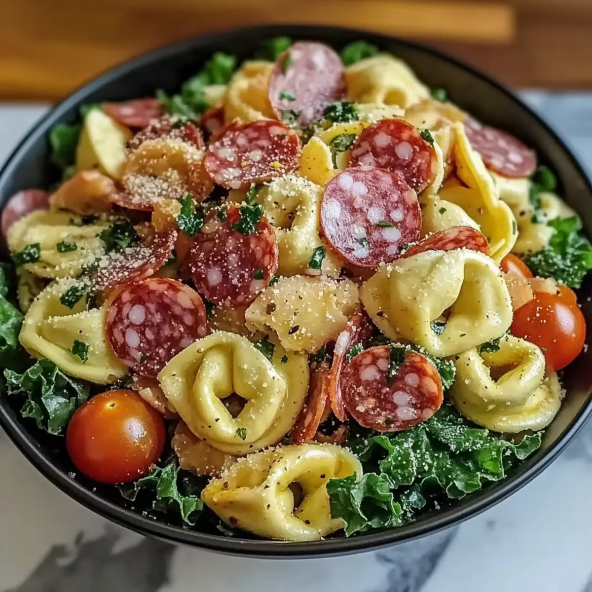 - Pour the prepared dressing over the mixed tortellini and meat ingredients in the bowl. Using a gentle tossing motion, combine everything so that the tortellini and toppings are evenly coated in the creamy dressing.
