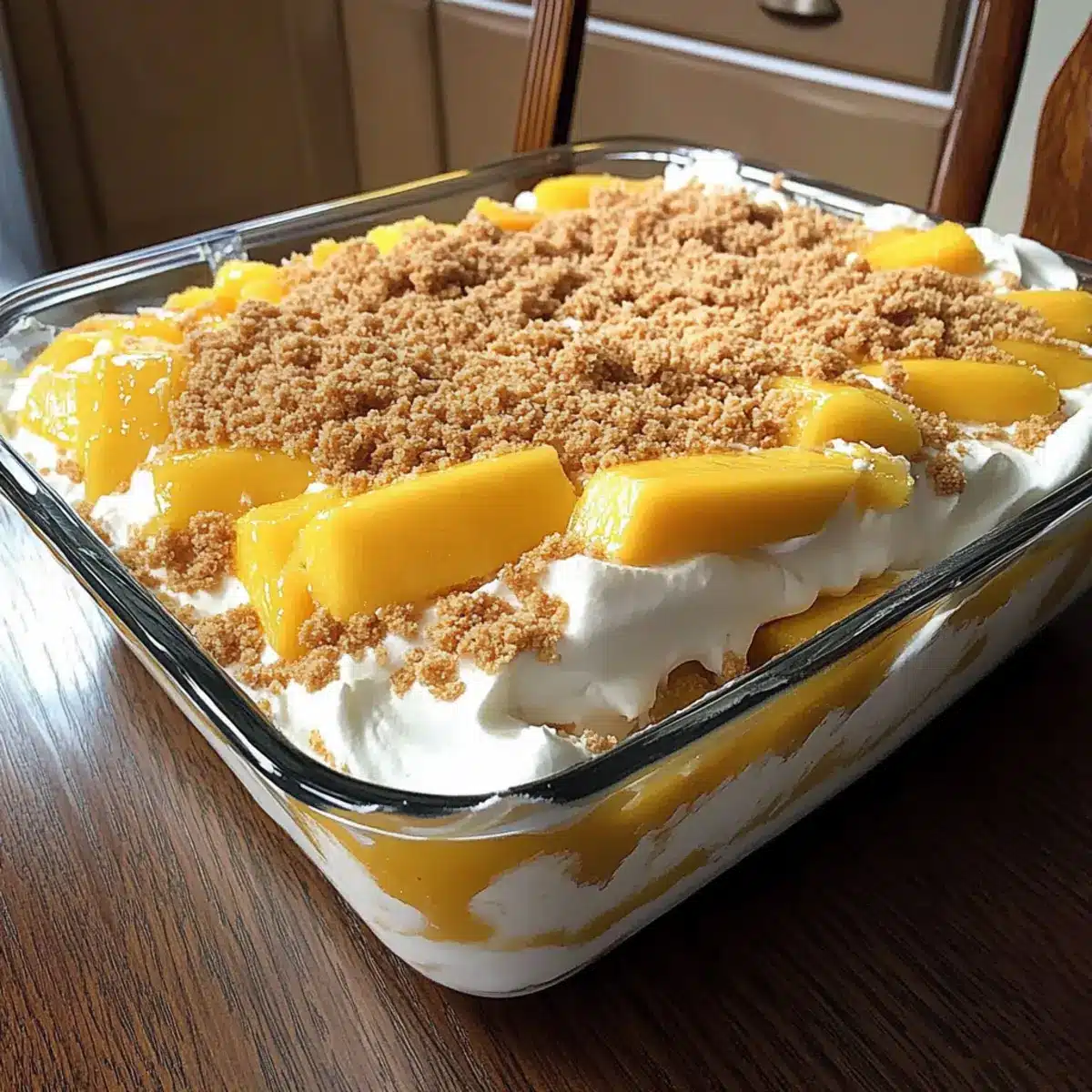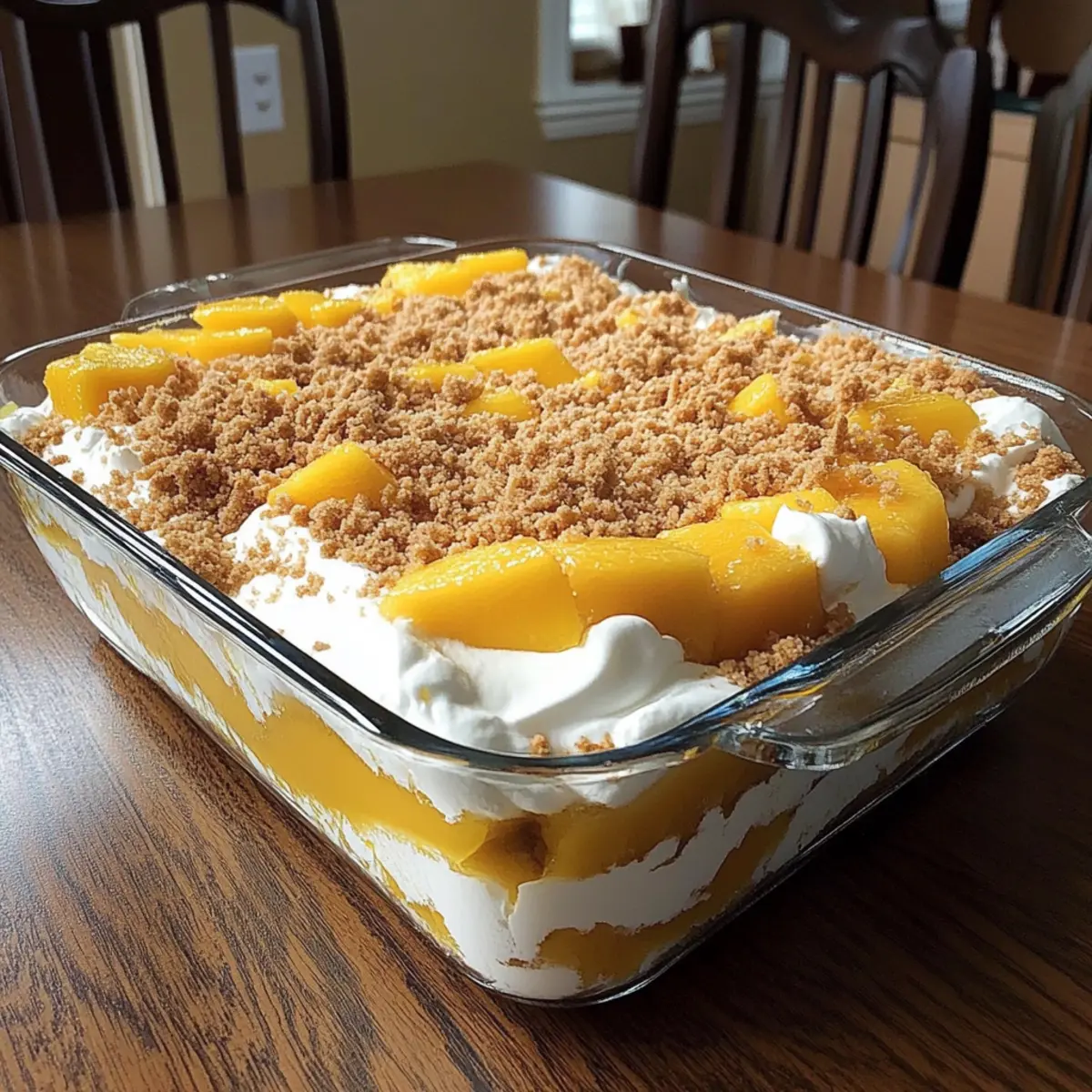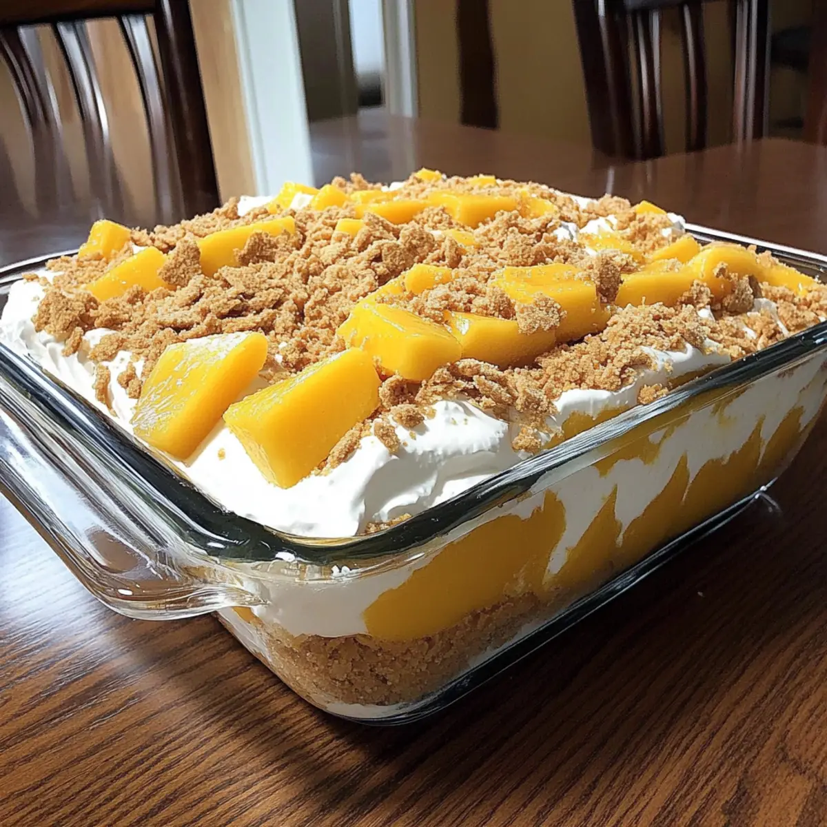 - Repeat the layering with another graham cracker layer, whipped cream, and mango slices, finishing with whipped cream and mangoes on top.