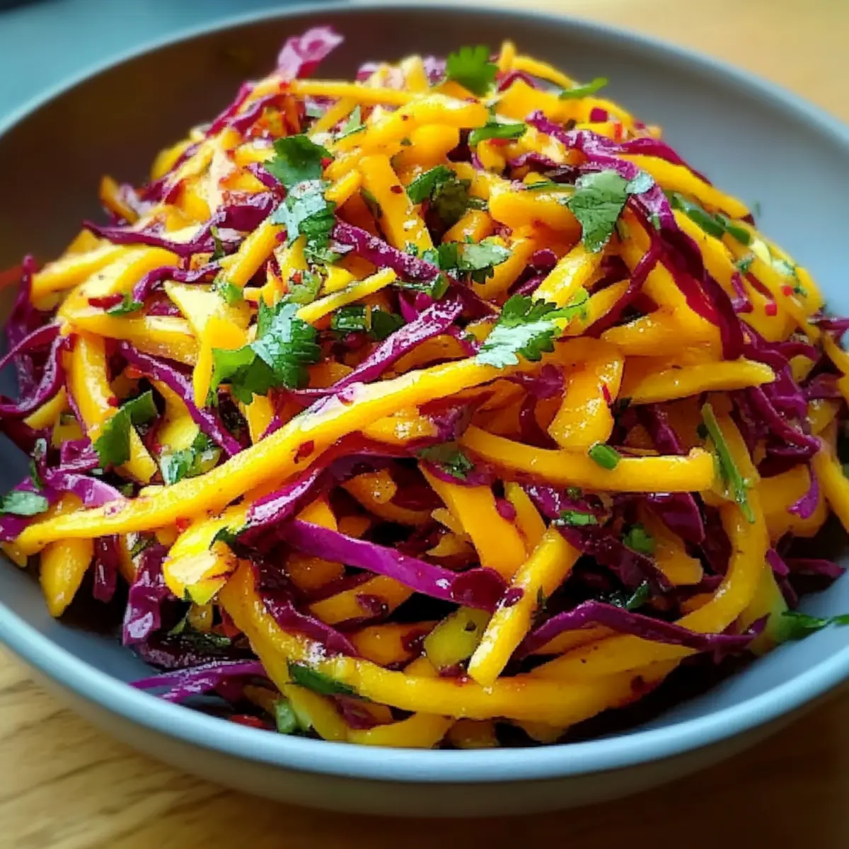 Bright, Fresh Ingredients: The combination of juicy mangoes with crunchy cabbage and sweet carrots creates a colorful medley that’s not just a feast for your eyes but also a burst of flavor in every bite.