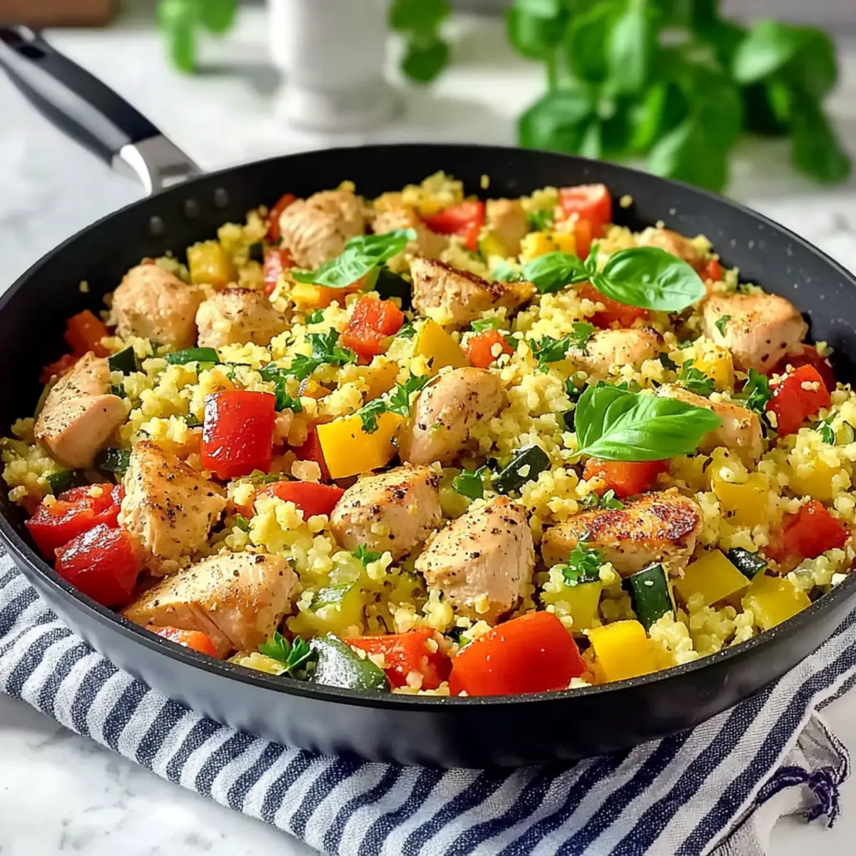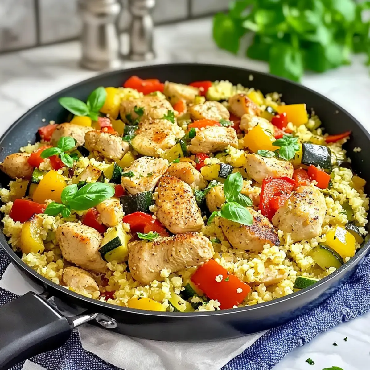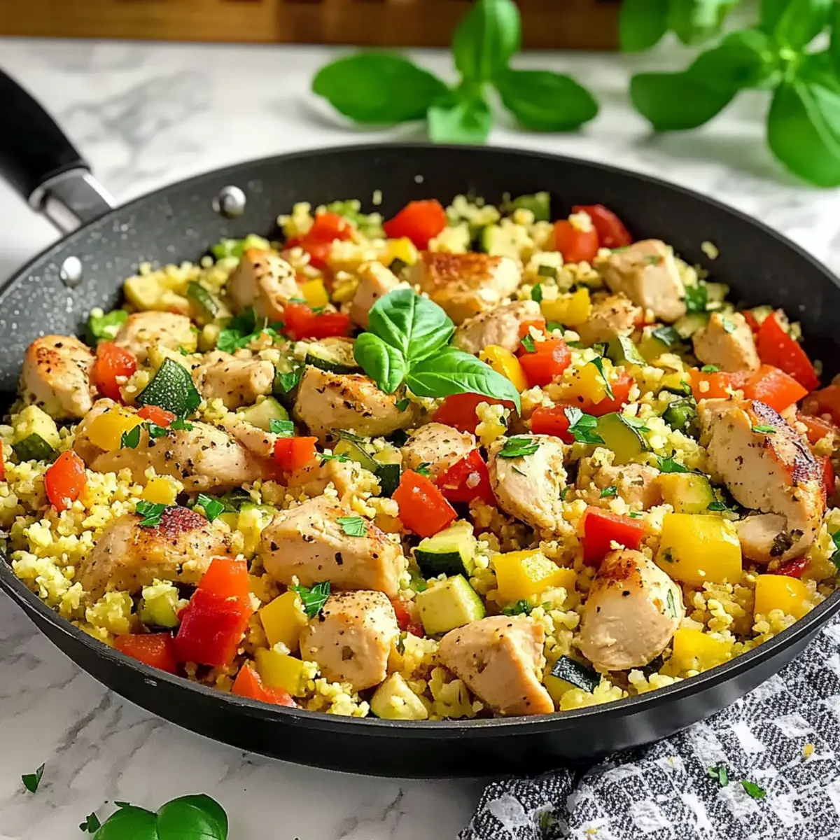 These One-Pan Mediterranean Cauliflower Rice with Chicken are perfect for busy weeknights! You can prepare all the vegetables (diced onion, minced garlic, chopped bell pepper, and sliced zucchini) up to 24 hours in advance; simply store them in an airtight container in the refrigerator to maintain their freshness. Additionally, season the chicken and refrigerate it for the same time period to let those flavors meld beautifully. When you’re ready to enjoy this dish, just sauté the garlic and onion, add the prepped vegetables and cauliflower rice, and finish cooking as instructed. This way, you’ll have a delicious, healthy meal ready in no time, making mealtime less stressful and just as delightful!