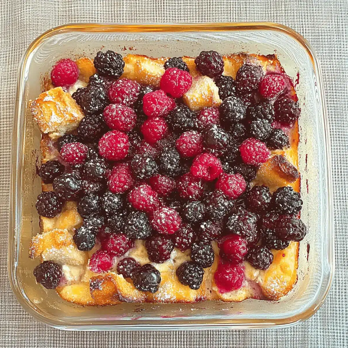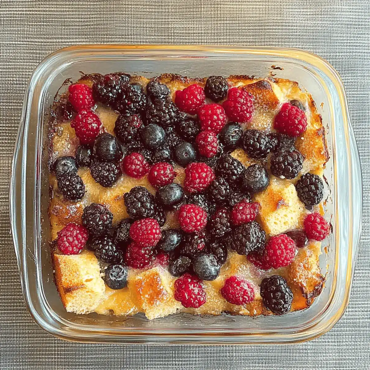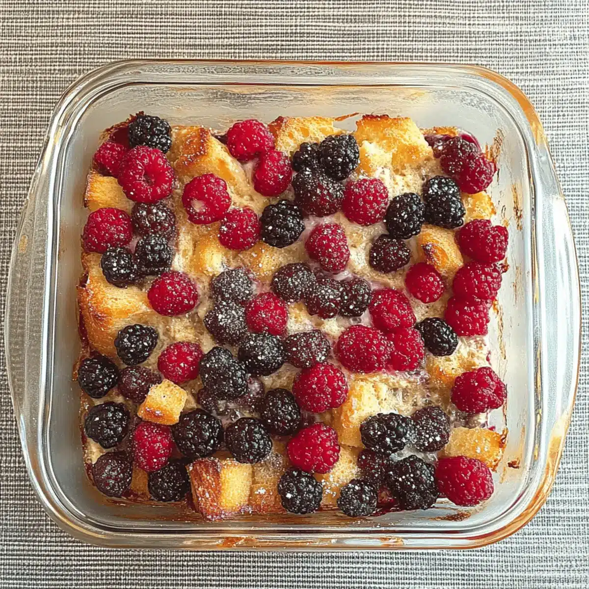 Spread your choice of fresh or frozen berries evenly over the top of the soaked bread mixture. Gently press the berries into the casserole to help them meld with the bread while it bakes. Cover the pan tightly with plastic wrap or foil and refrigerate overnight, allowing the flavors to meld beautifully.