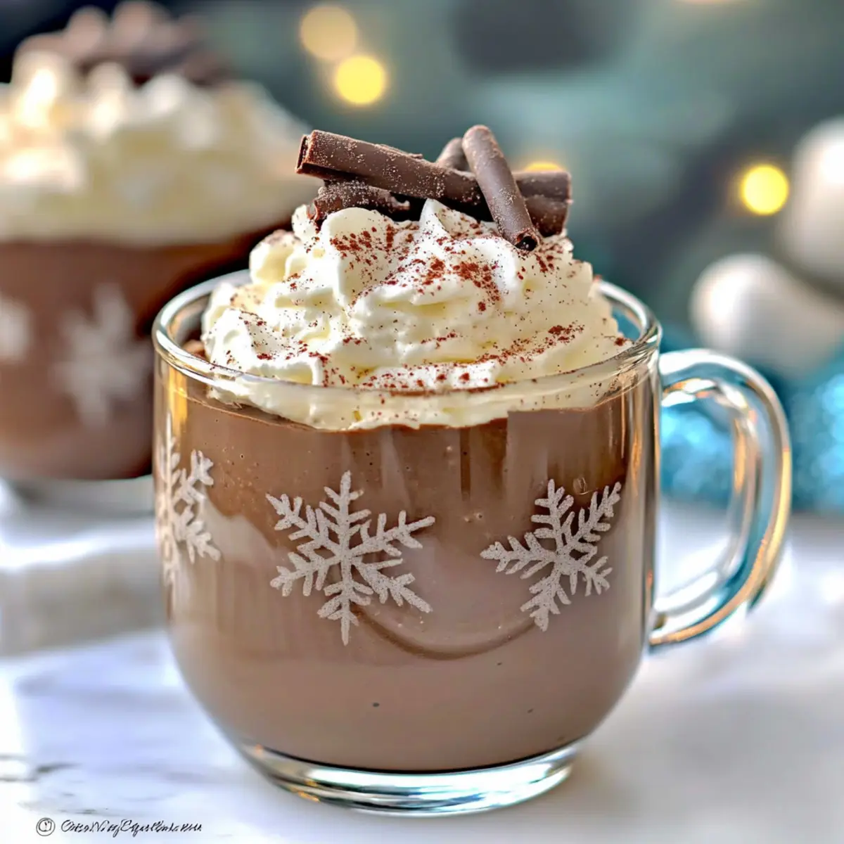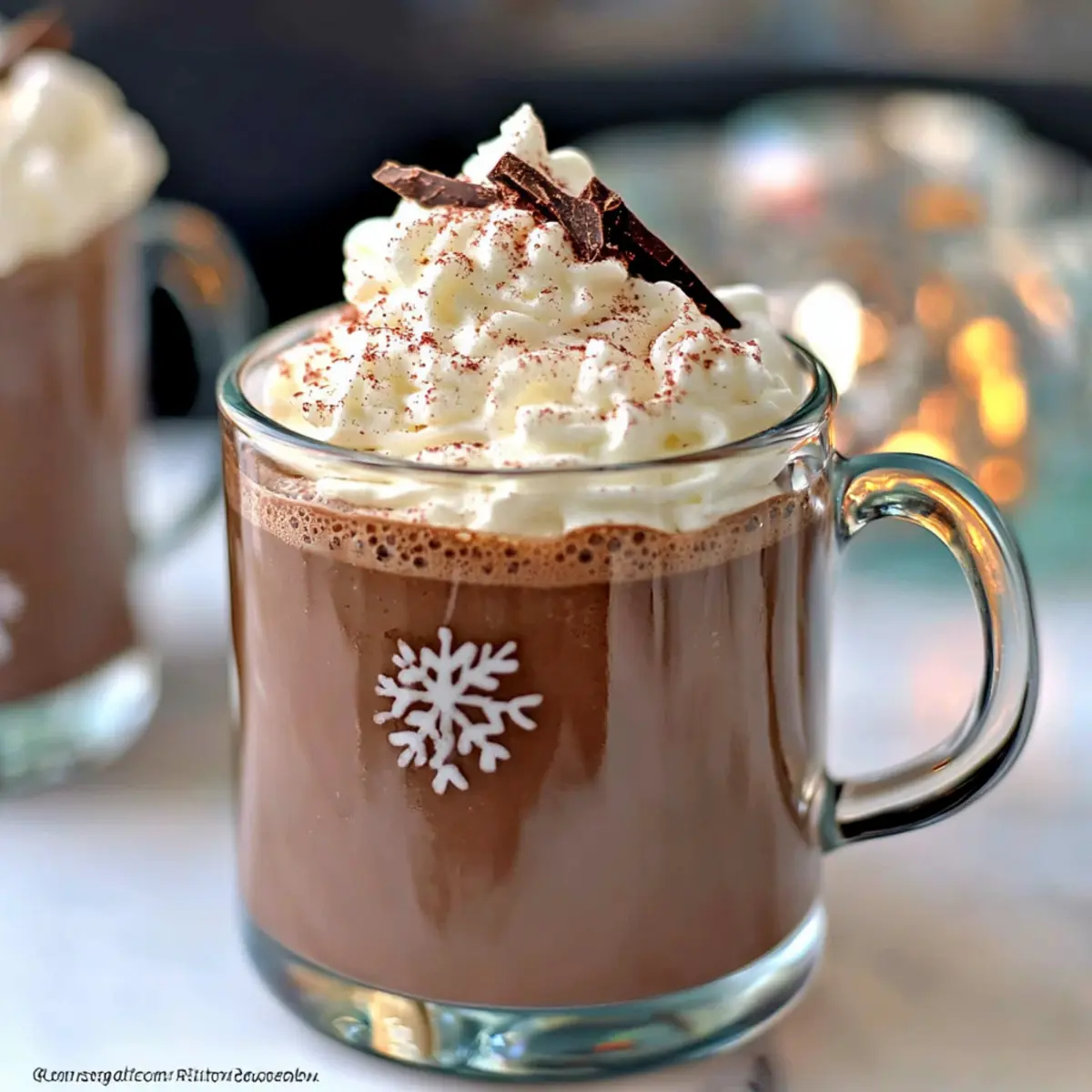 - Pour the hot chocolate into warm mugs, fill them three-quarters full, and top with the whipped cream. Enjoy warm.