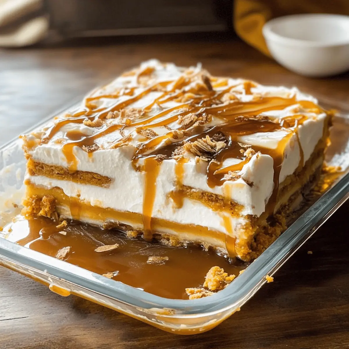 Once chilled, remove the Pumpkin Cheesecake Lasagna from the refrigerator. Just before serving, drizzle caramel sauce over the top, allowing it to cascade down the layers. Cut into squares and serve chilled, delighting your guests or treating yourself to this creamy and decadent dessert that’s sure to impress.