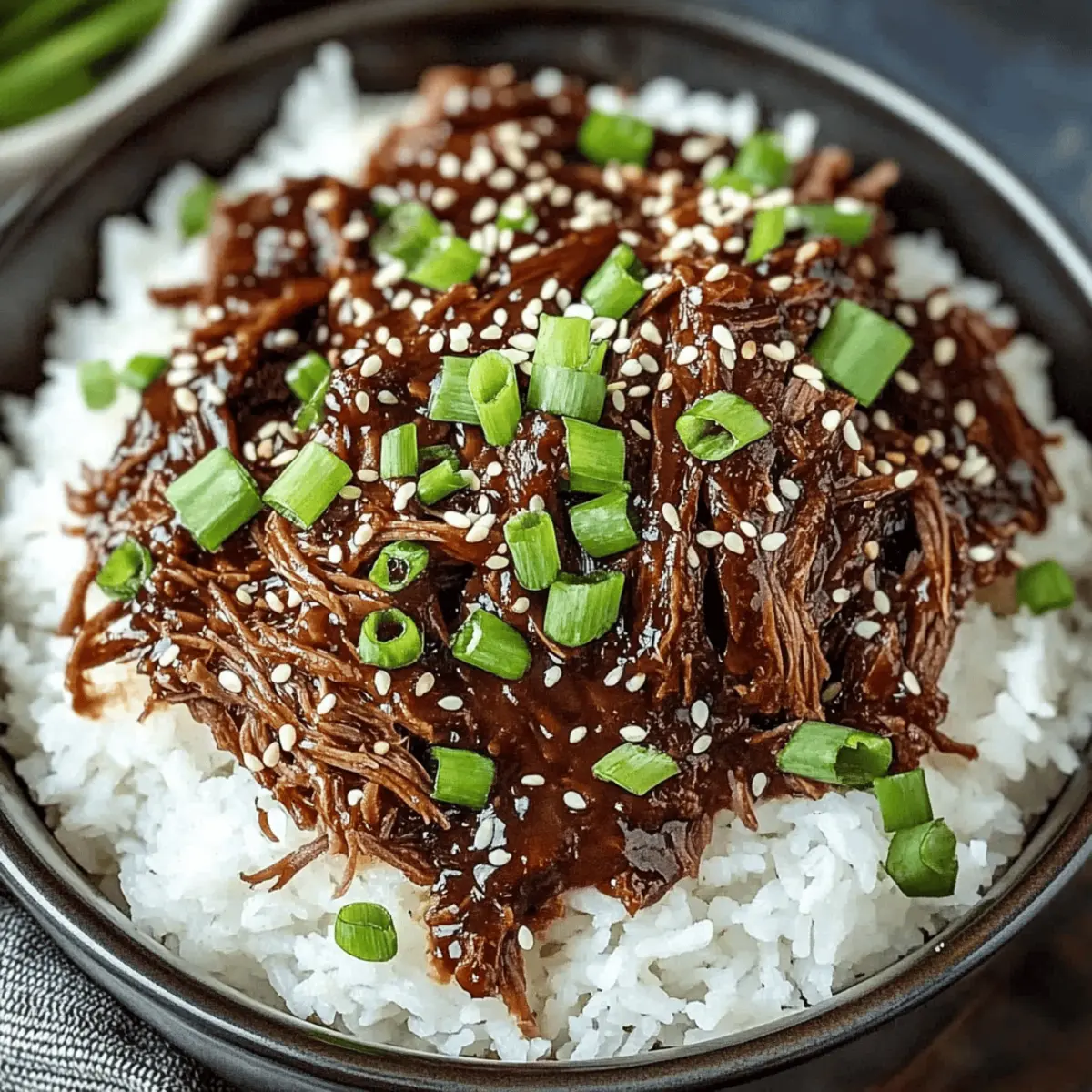 Prepare a plate of fluffy cooked rice as the perfect base for your flavorful Slow Cooker Korean Beef. Generously spoon the tender beef and rich sauce over the rice. For an extra pop of flavor, garnish with chopped green onions and a sprinkle of sesame seeds. If you’re a fan of spice, serve with a side of kimchi for an authentic touch that elevates the meal.