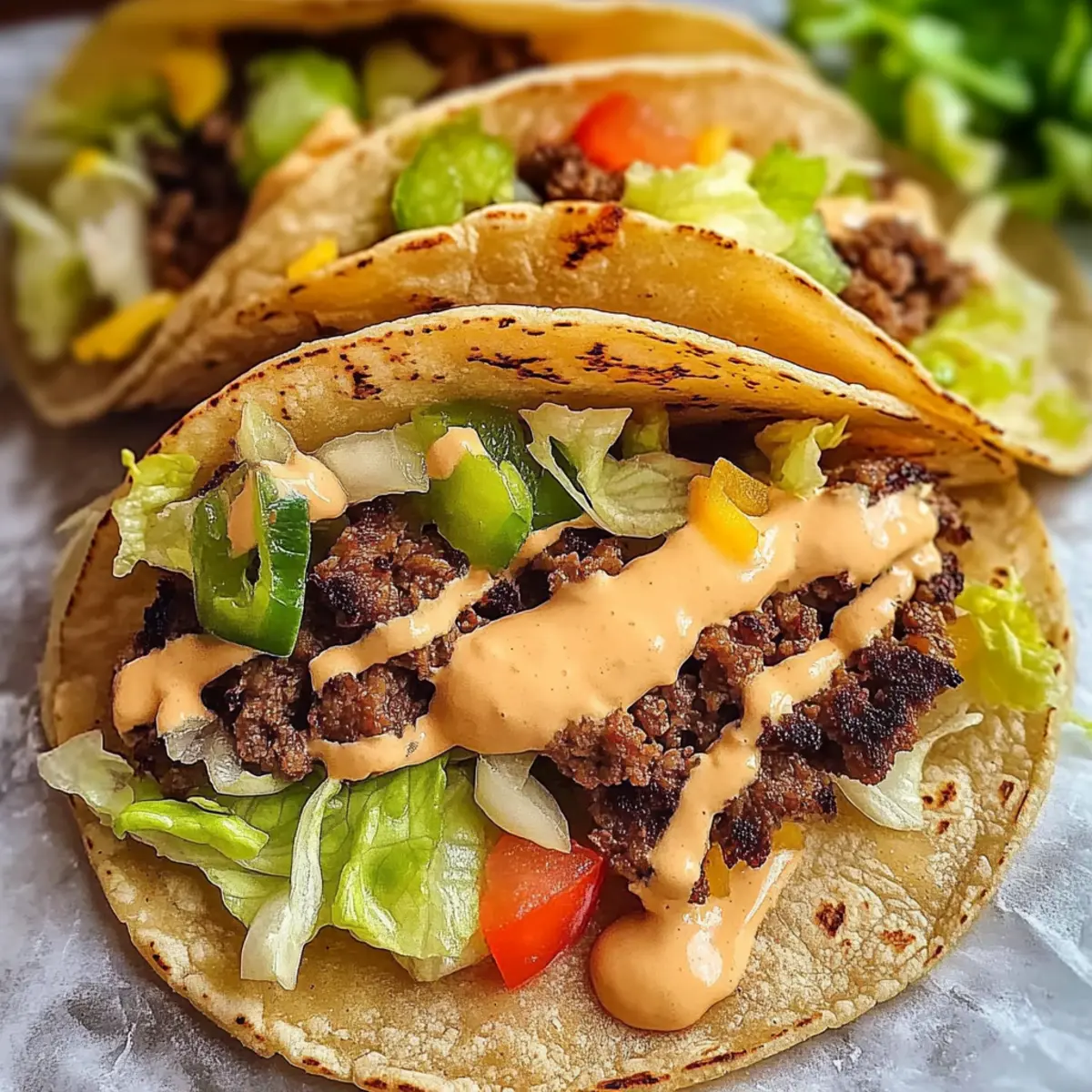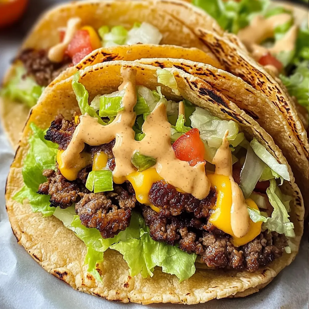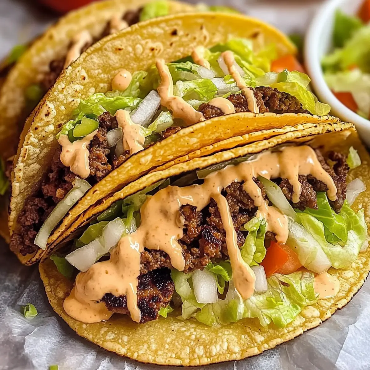 These Smash Burger Tacos are perfect for busy weeknights or meal prep! You can prepare the seasoned ground beef up to 3 days in advance by cooking it and then storing it in an airtight container in the refrigerator. Warm it up in the skillet before assembling. Additionally, you can make your homemade sauce up to 24 hours ahead, allowing the flavors to meld beautifully—just store it in a sealed jar in the fridge. Finally, chop any fresh toppings like lettuce and tomatoes a day prior, keeping them in separate containers to maintain their crunch. When it’s time to serve, simply heat the tortillas, assemble, and enjoy restaurant-quality tacos with minimal effort!