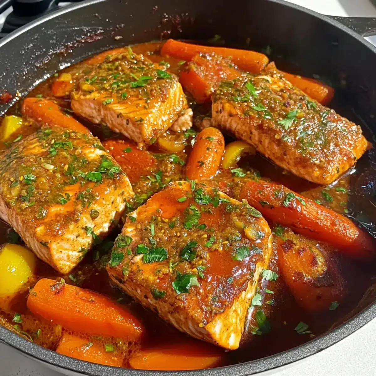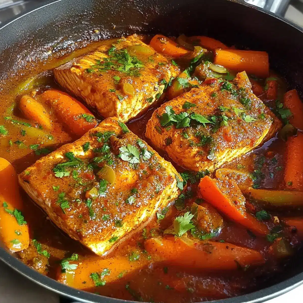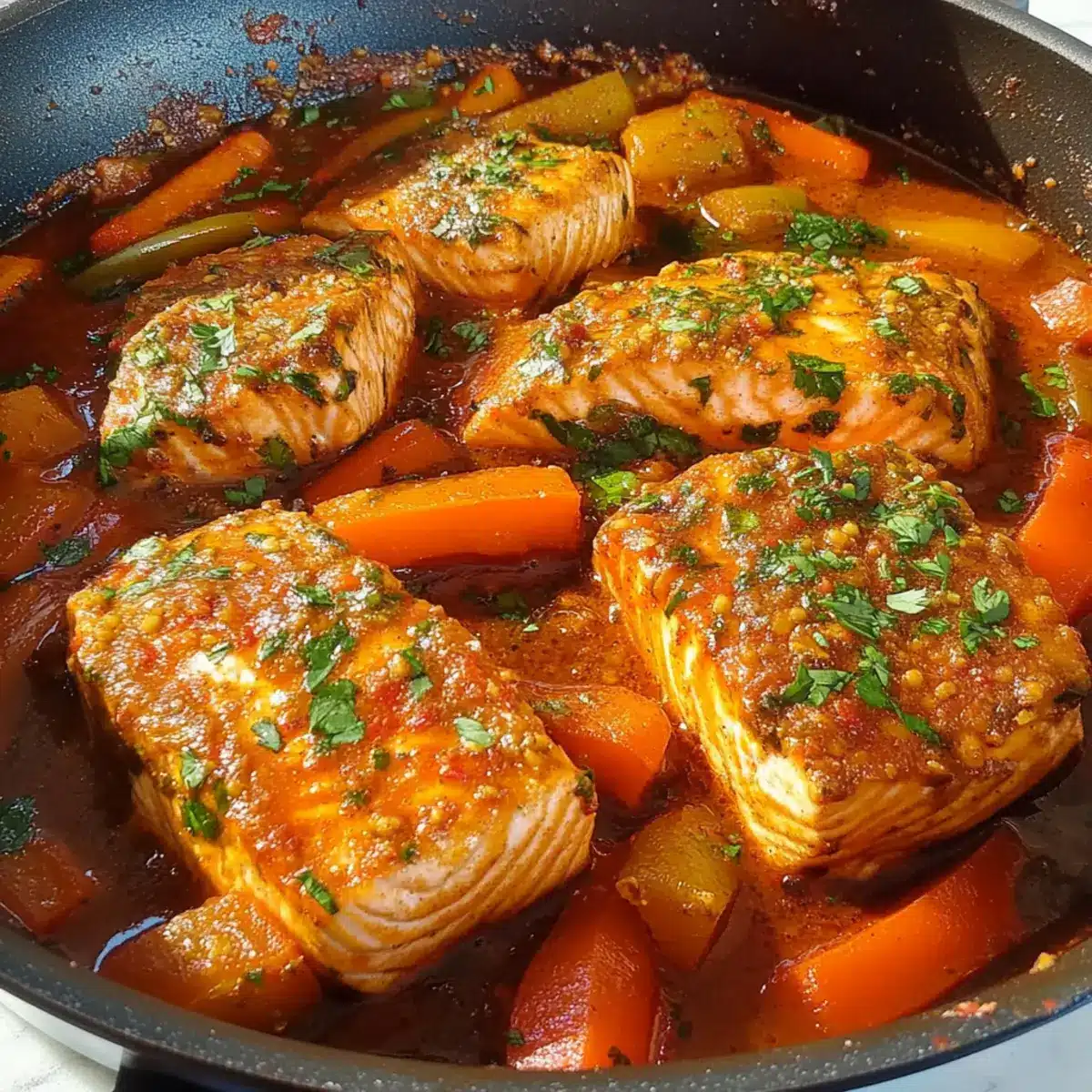 While the sauce simmers, season your salmon fillets with coarse salt. Carefully place the fish into the pan, ensuring they are nestled among the vegetables. Spoon some sauce over the fish to infuse flavor as they cook. This is where the magic happens, turning it into a delightful centerpiece of your dish.
