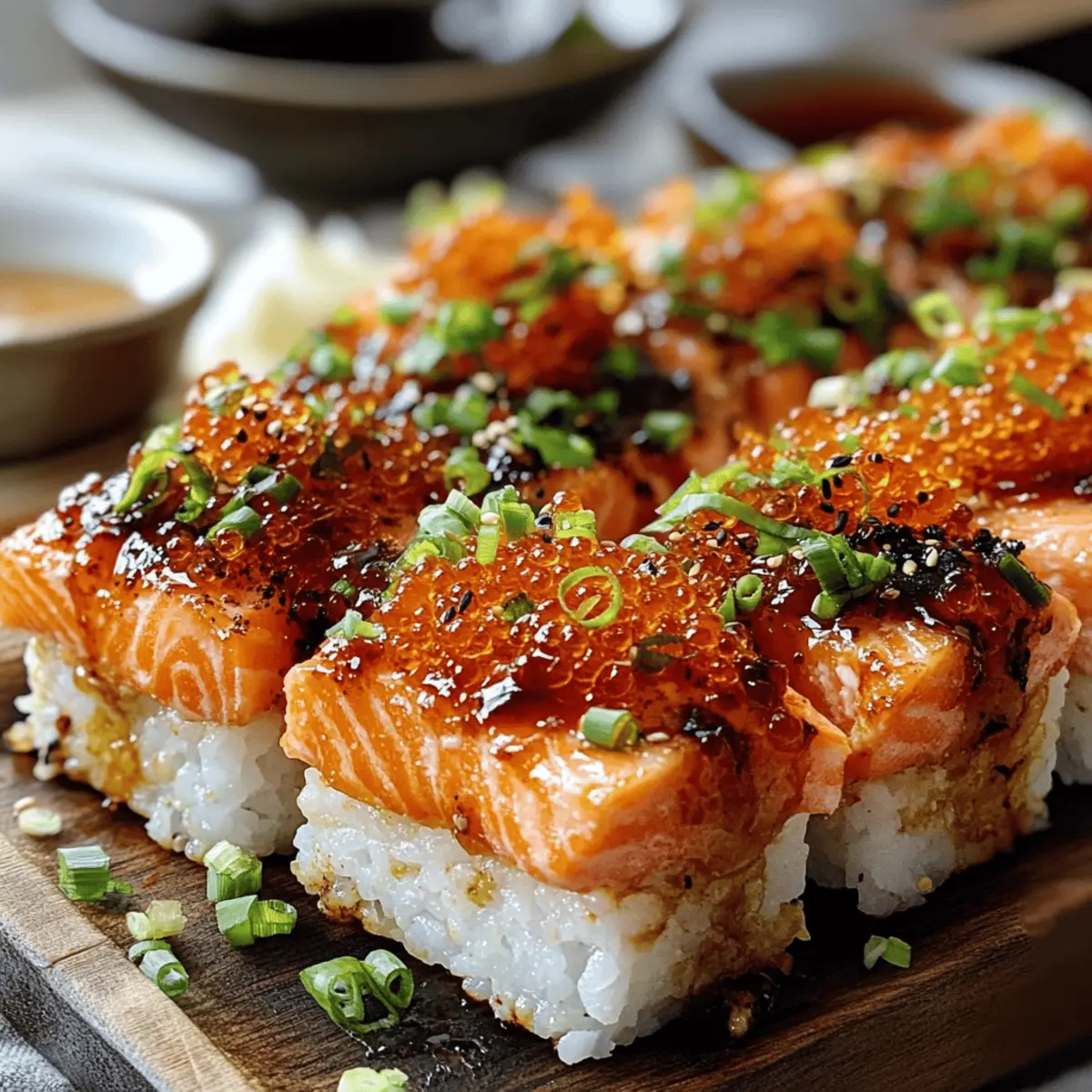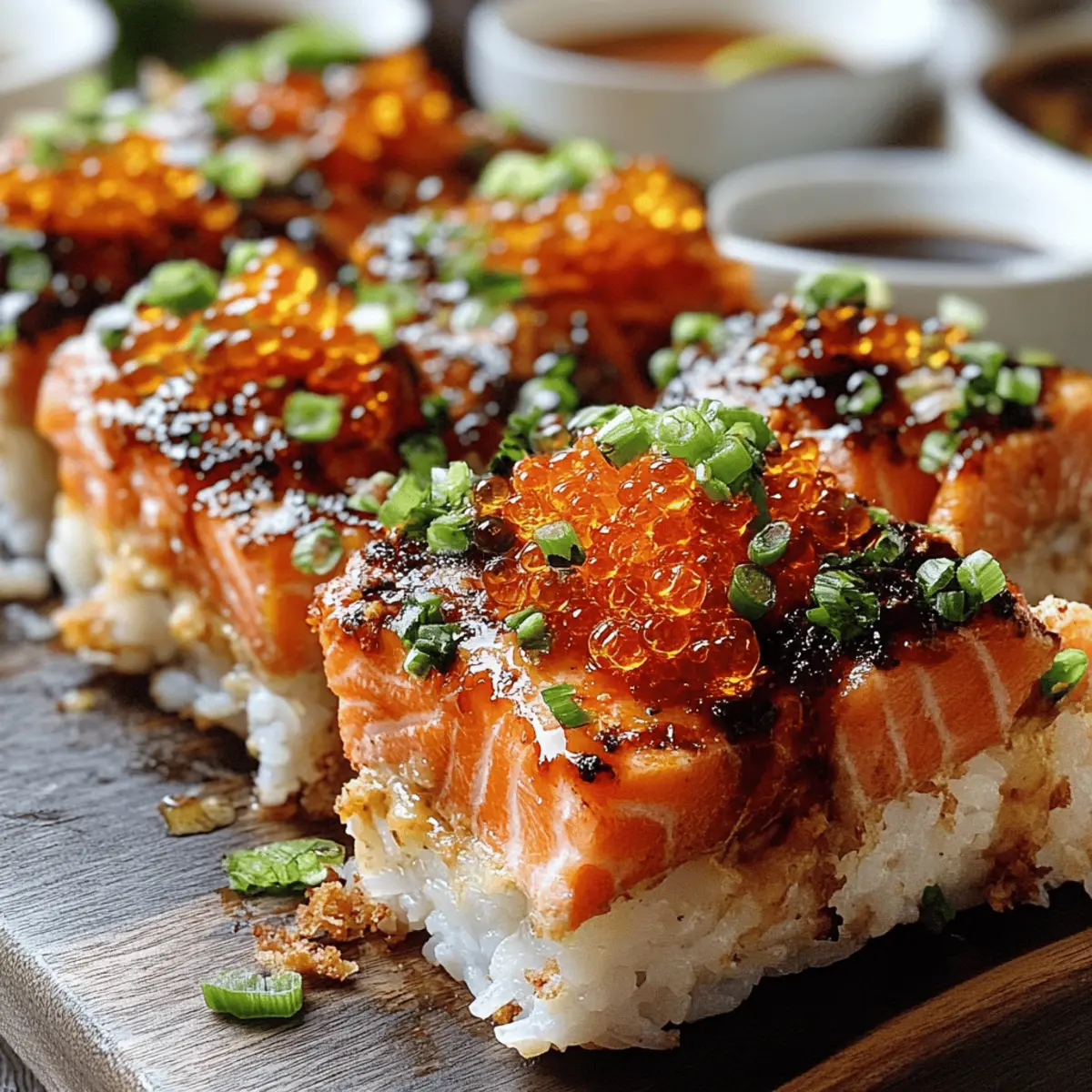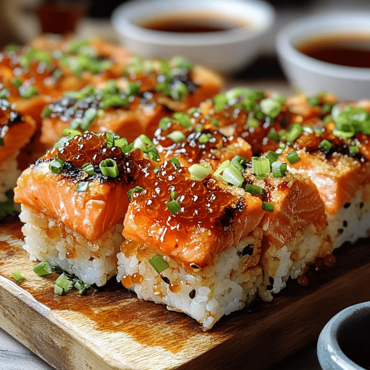 Once out of the oven, allow your Spicy Salmon Sushi Bake to cool slightly for about 5 minutes. Garnish with additional chopped green onions, crisp nori, and optional tobiko for a pop of color. Serving this warm, family-style will invite everyone to dive in and enjoy the rich flavors of this unique dish.