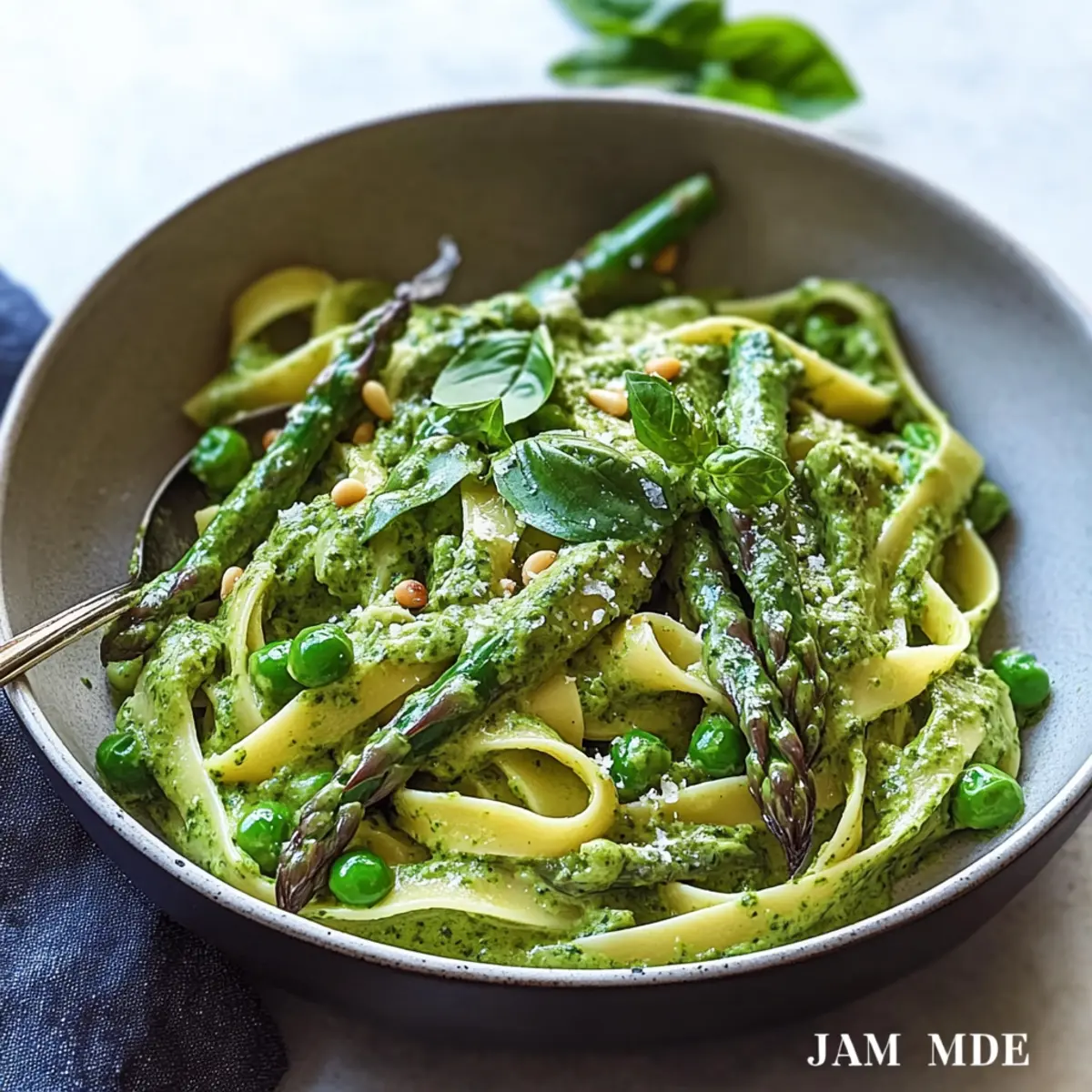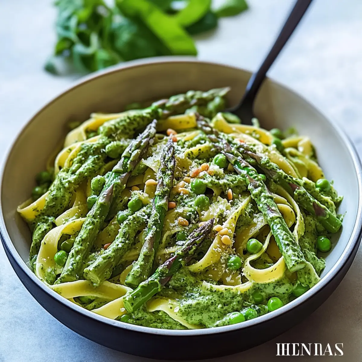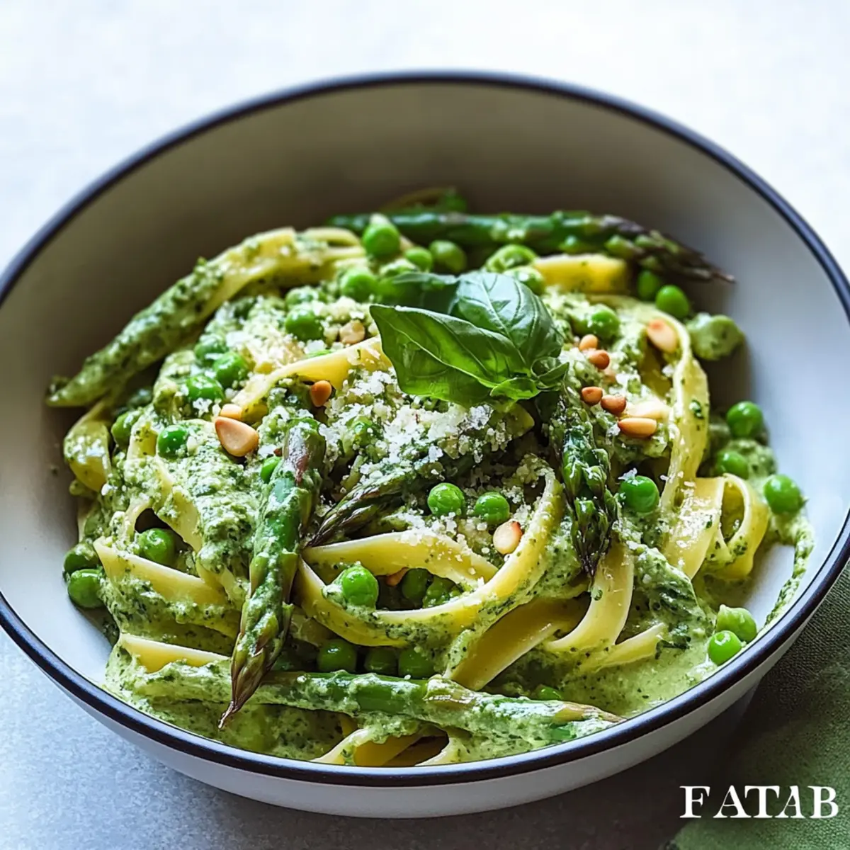 With everything prepared, add the cooked fettuccine directly into the skillet with the creamy spinach sauce, and gently toss to coat the pasta. Then, fold in the blanched asparagus and peas, ensuring even distribution. Serve warm, garnished with freshly chopped basil, toasted pine nuts or slivered almonds, and additional Parmesan if desired.
