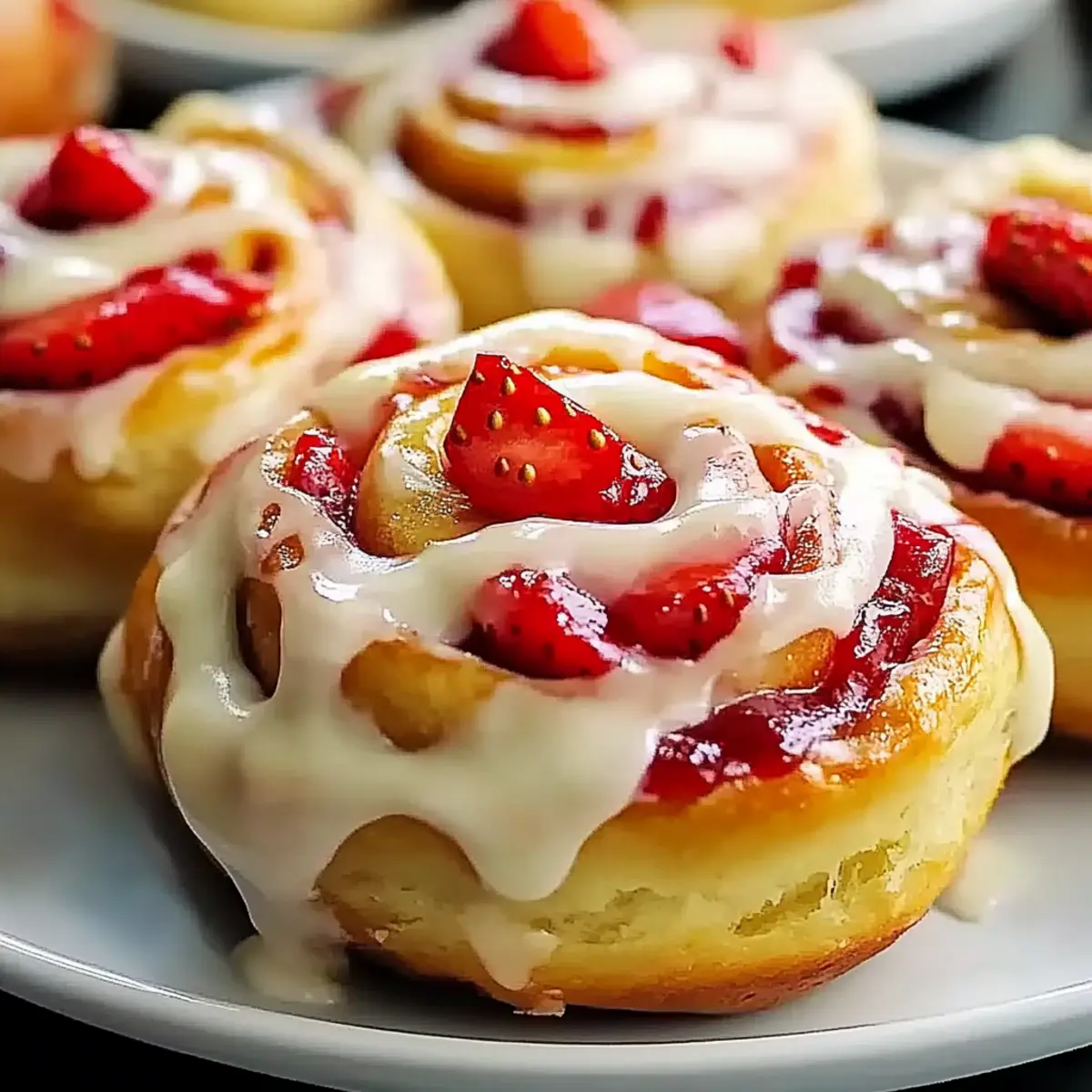 - Once the rolls are baked, let them cool slightly before drizzling the icing over the top. Add sliced strawberries and serve warm.