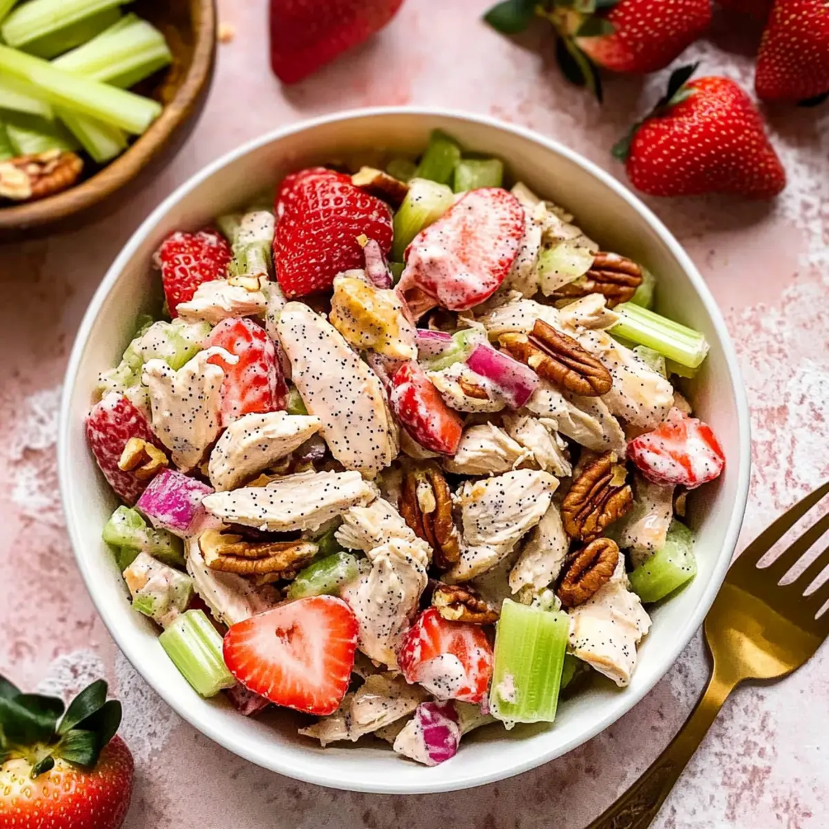 Vibrant Colors: This Strawberry Poppy Seed Chicken Salad dazzles with its bright red strawberries and green celery, making it a feast for the eyes!