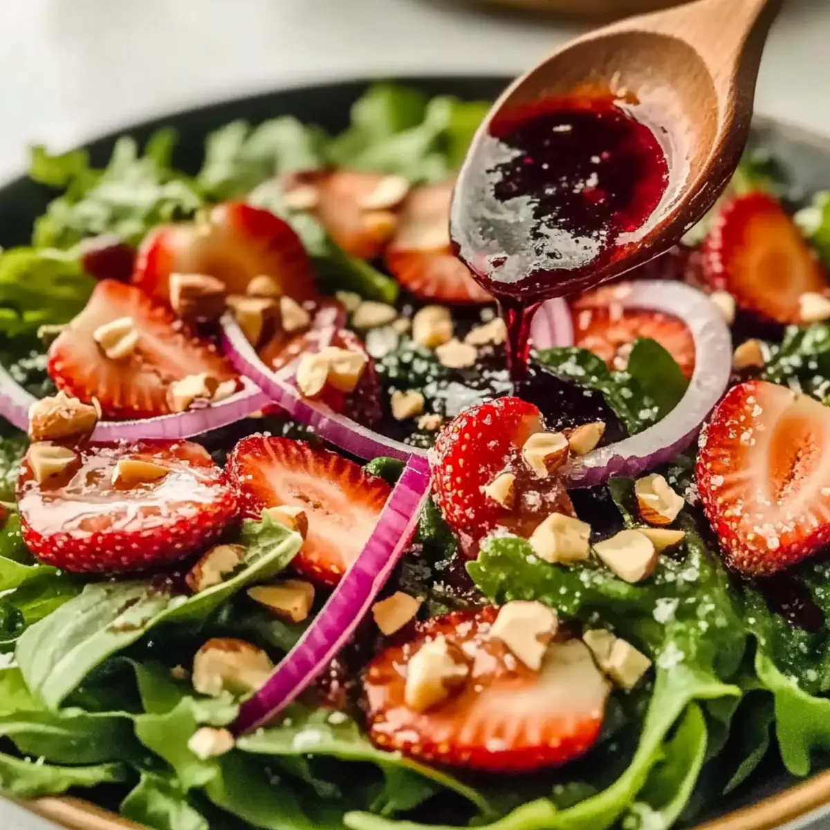 - Assemble Salad: Layer greens, strawberries, onions, toasted nuts, and feta in a bowl; drizzle with vinaigrette.