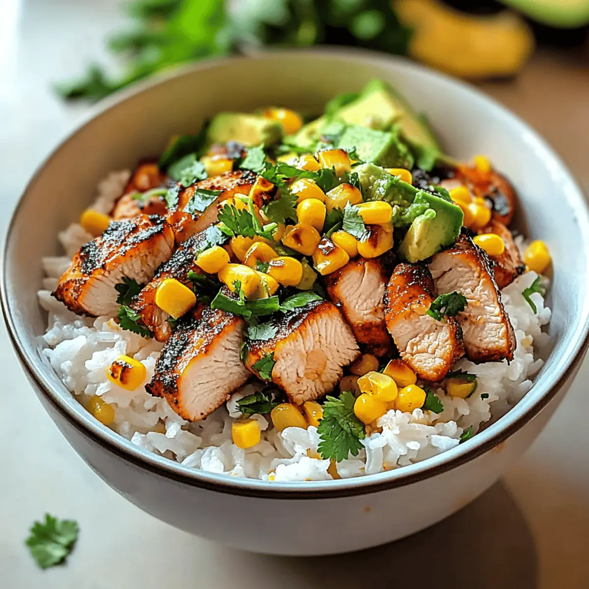To create your Street Corn Chicken Rice Bowl, start with a generous scoop of the cooked rice as the base. Layer on the sliced, juicy chicken, followed by the sautéed corn. Sprinkle fresh cilantro on top for a burst of flavor and color, and finish off with sliced avocado and a squeeze of lime juice to elevate the dish.