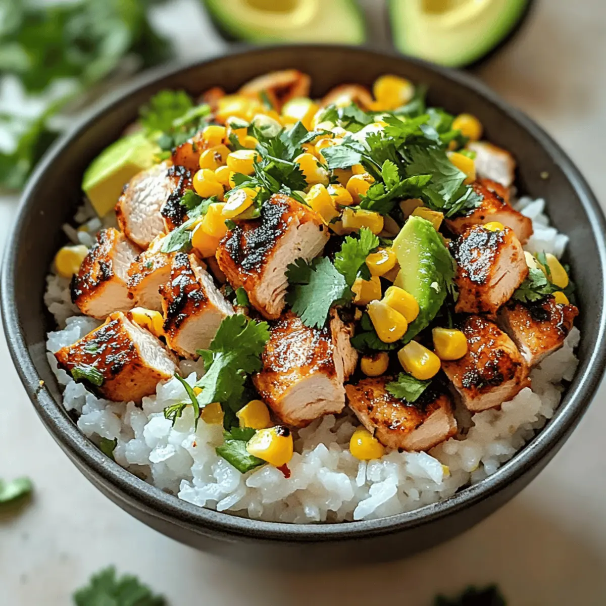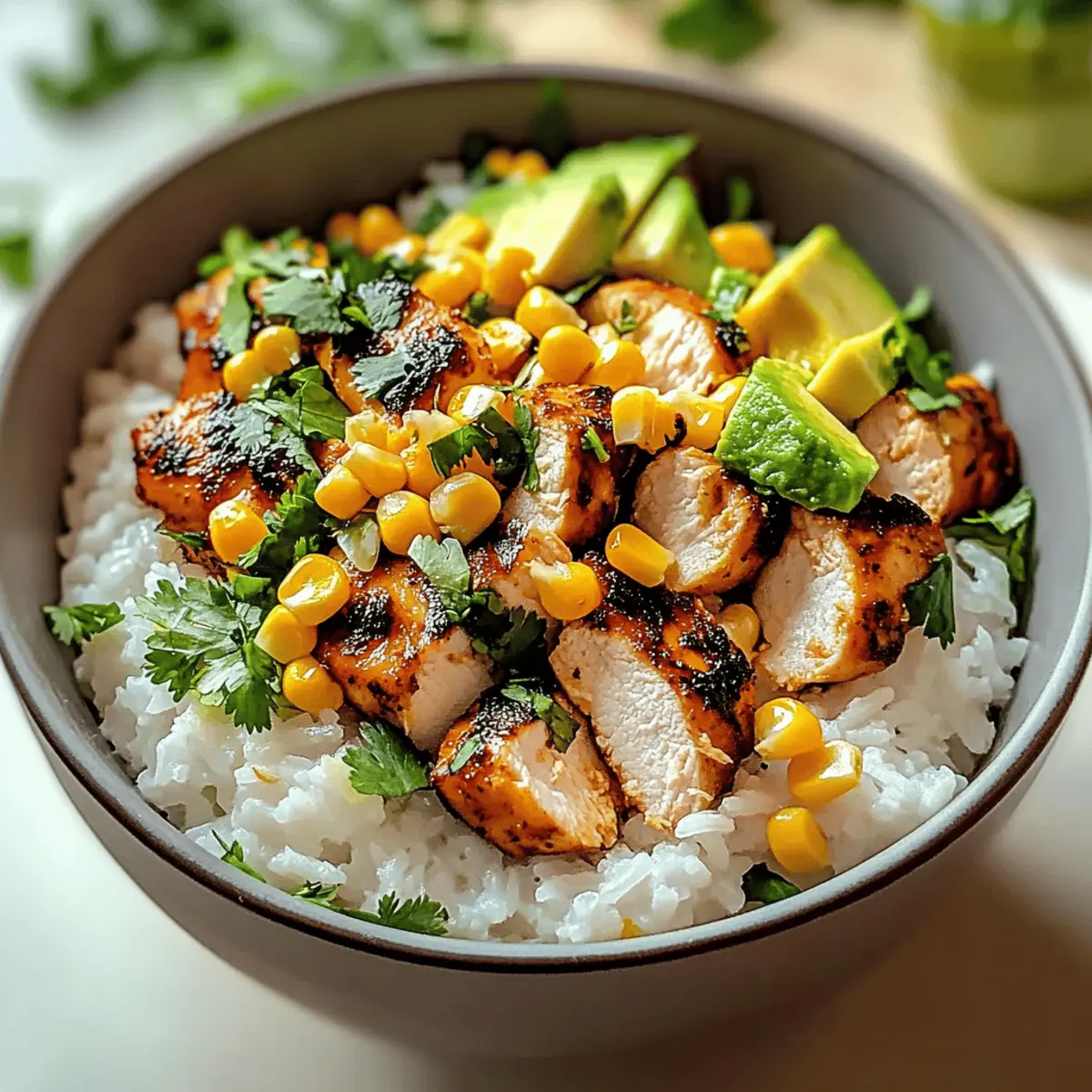 - To assemble, start with a scoop of rice as the base, layer on sliced chicken and sautéed corn, then top with fresh cilantro, sliced avocado, and a squeeze of lime juice.