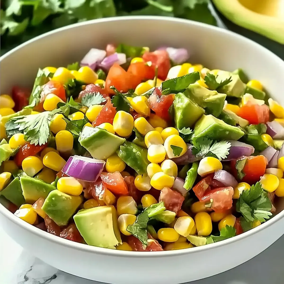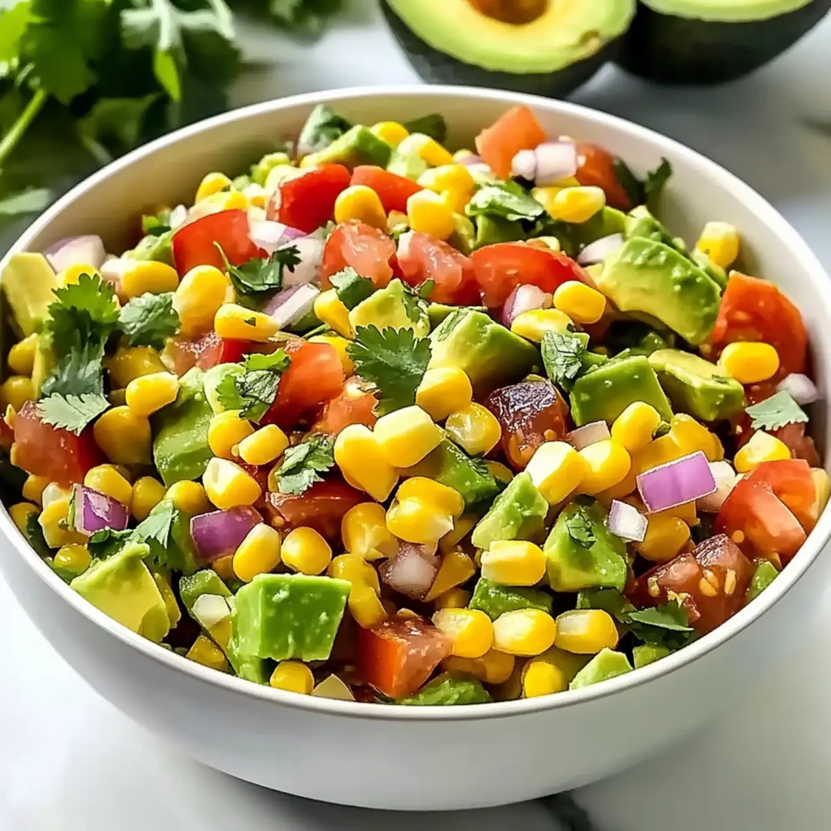 In a large mixing bowl, combine the prepared corn, diced tomatoes, chopped red onion, and finely chopped cilantro. Give everything a gentle toss to distribute the ingredients evenly, ensuring each bite of your Summer Corn Salad with Avocado bursts with flavor. Aim for a colorful mix to make your salad visually appealing, and set it aside while you prepare the dressing.