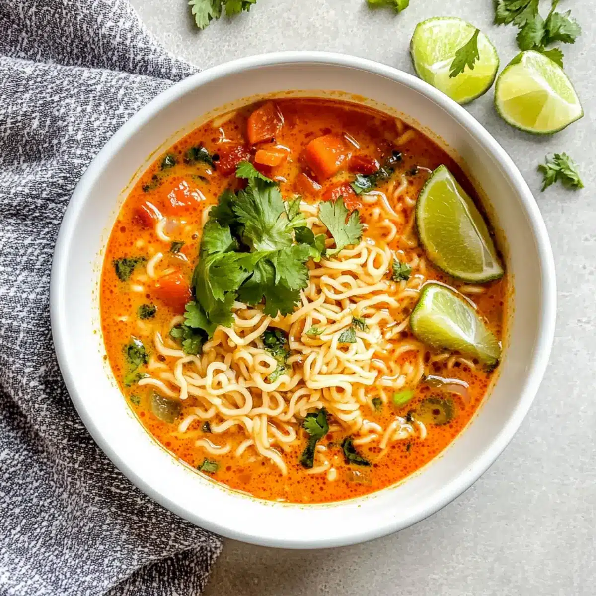 Stir in your ramen noodles (about 2 servings) and cook according to the package instructions, usually around 3-4 minutes. Make sure to stir occasionally to prevent sticking. As the noodles soften and absorb the flavors, your comforting Thai Curry Soup will begin to take its signature creamy form.