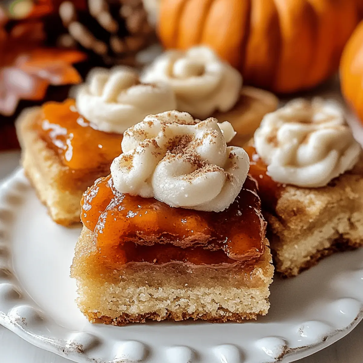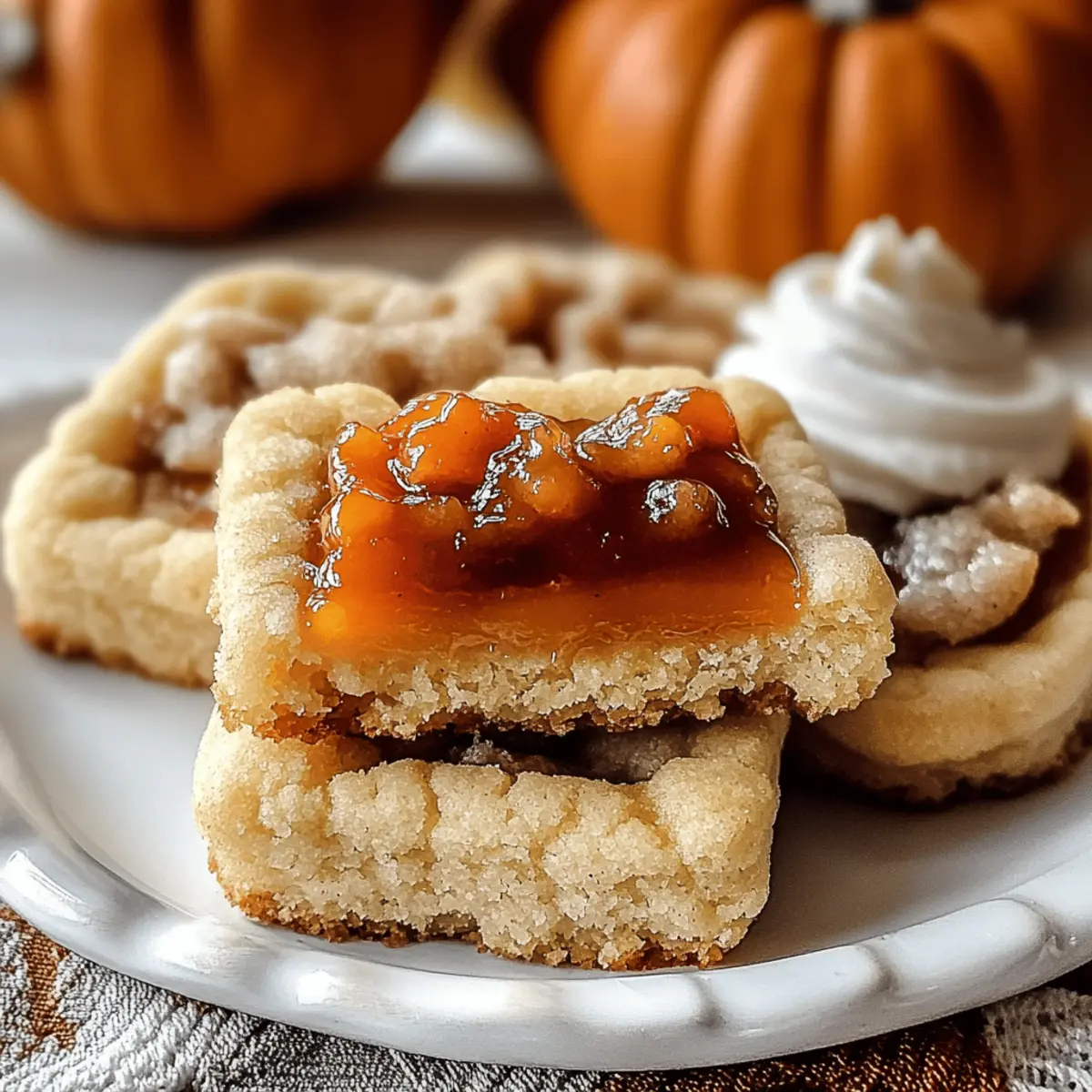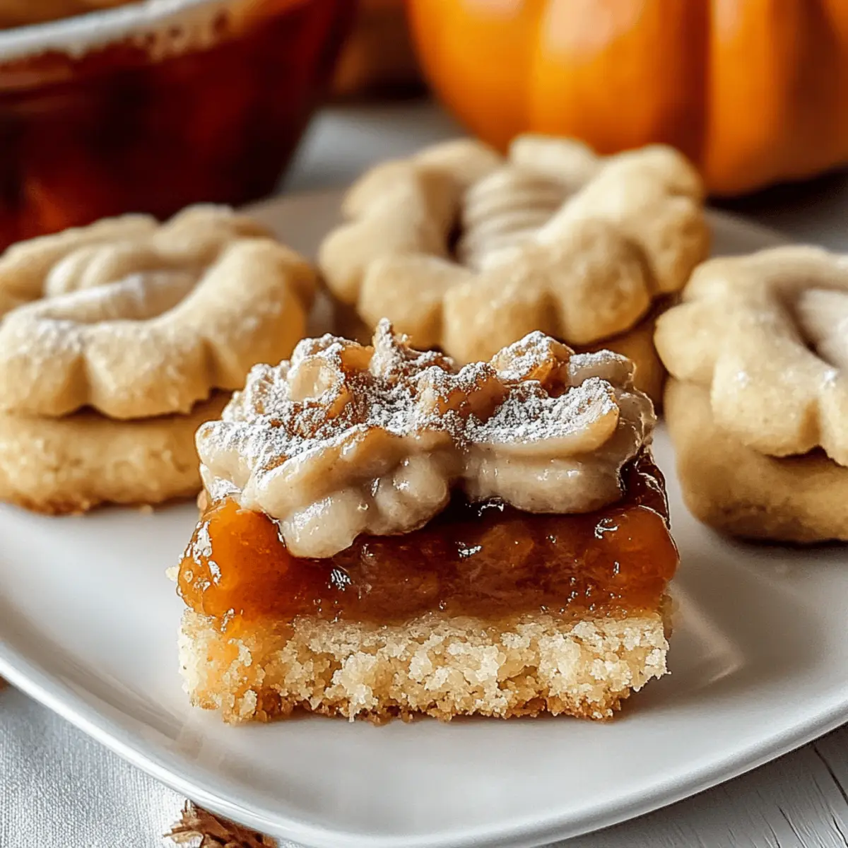 Irresistible flavors: The combination of creamy pumpkin pie filling and buttery shortbread creates a taste sensation that you won’t forget. Festive and cozy: With spices like cinnamon and nutmeg, each bite evokes the warmth of autumn gatherings. Quick and easy: Perfect for home bakers of any skill level, this recipe comes together in a snap. Versatile options: With suggested variations for gluten-free or dairy-free diets, everyone can enjoy these treats. If you love seasonal flavors, check out our pumpkin pie cookie or pumpkin cupcakes for more delightful recipes!