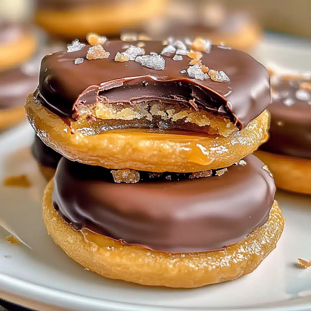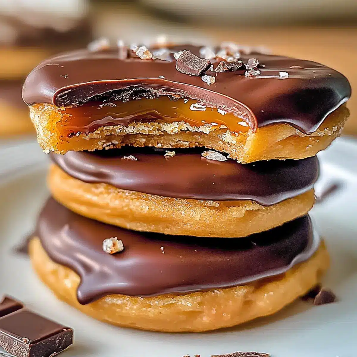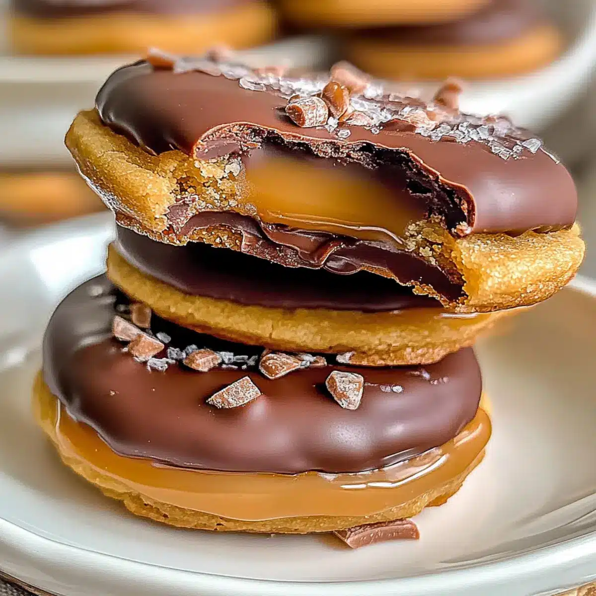 Melt 1 cup of chocolate chips in a microwave-safe bowl, heating in 30-second intervals and stirring until smooth. Drizzle the melted chocolate over each cookie, covering the caramel layer beautifully. Let the chocolate set at room temperature for about 15-20 minutes, or until firm to the touch.